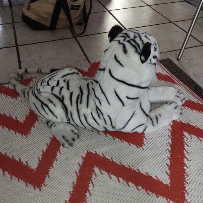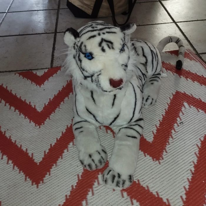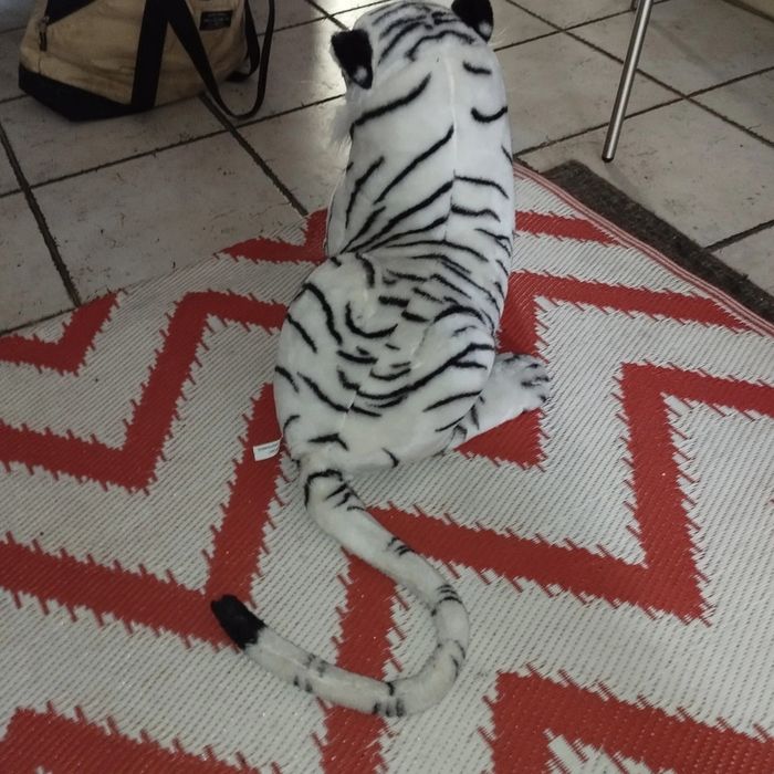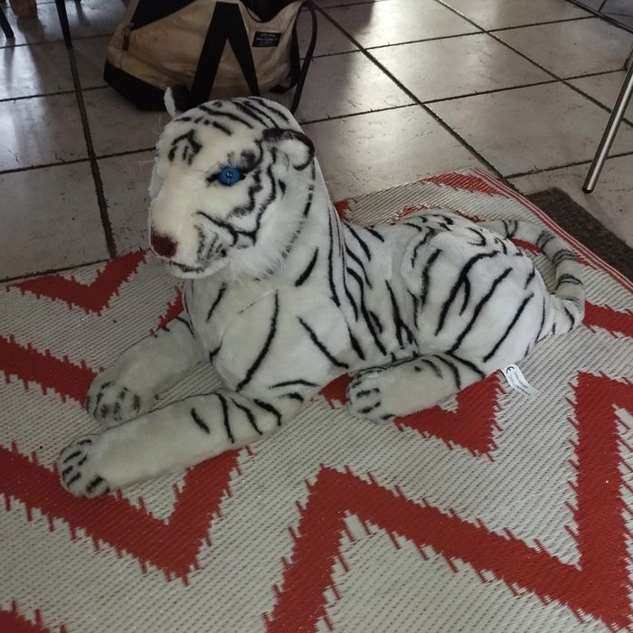 Peluche tigre blanc fausse fourrure synthétique rayé longueur avec queue 116 cm corps 58 cm et hauteur 38 cm marque splash toy's très bon état utilisé normalement (visiter mon site les prix sont abordables et négociable)
