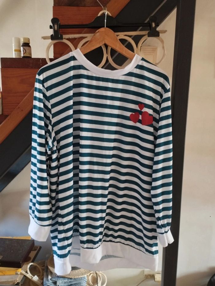 Tee-shirt mixte rayé avec petit motif coeur coton manches longues marque New collection taille M très bon état porté normalement ( visiter mon site les prix sont abordables et négociable)