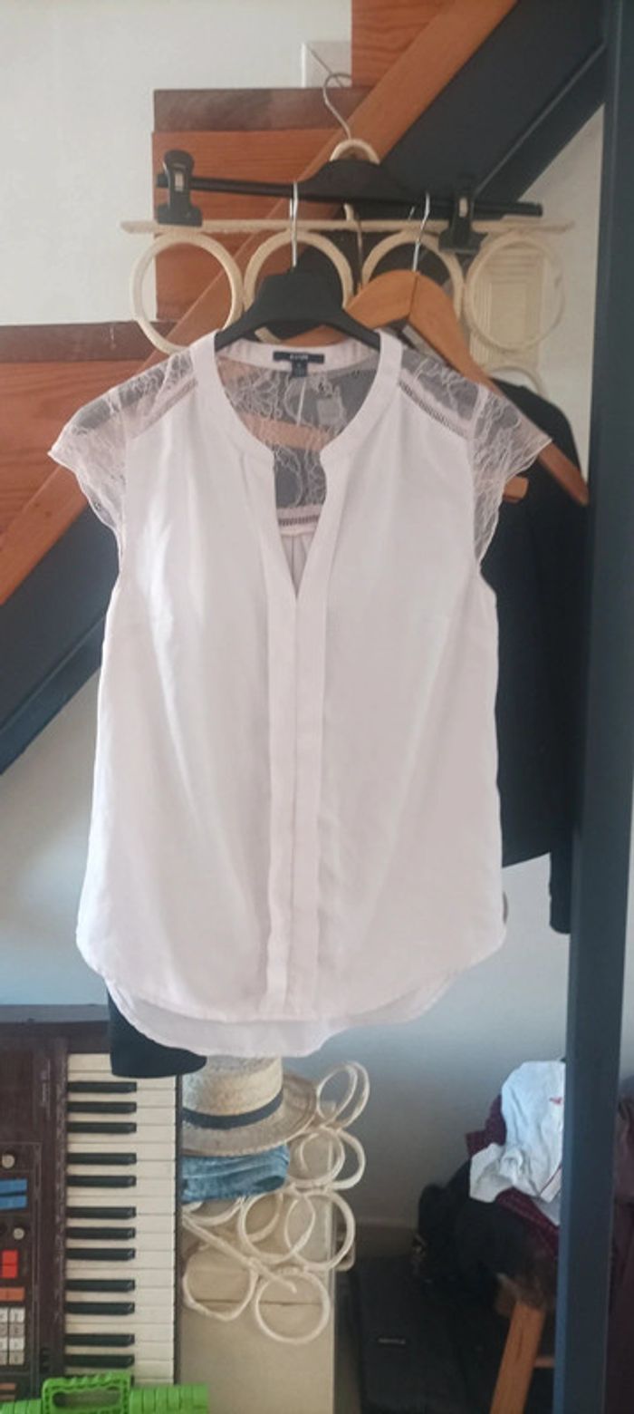 Top blouse femme blanche en dentelle taille M marque Kiabi polyester manches courtes très bon état porté normalement visiter mon site les prix sont abordables et négociable)