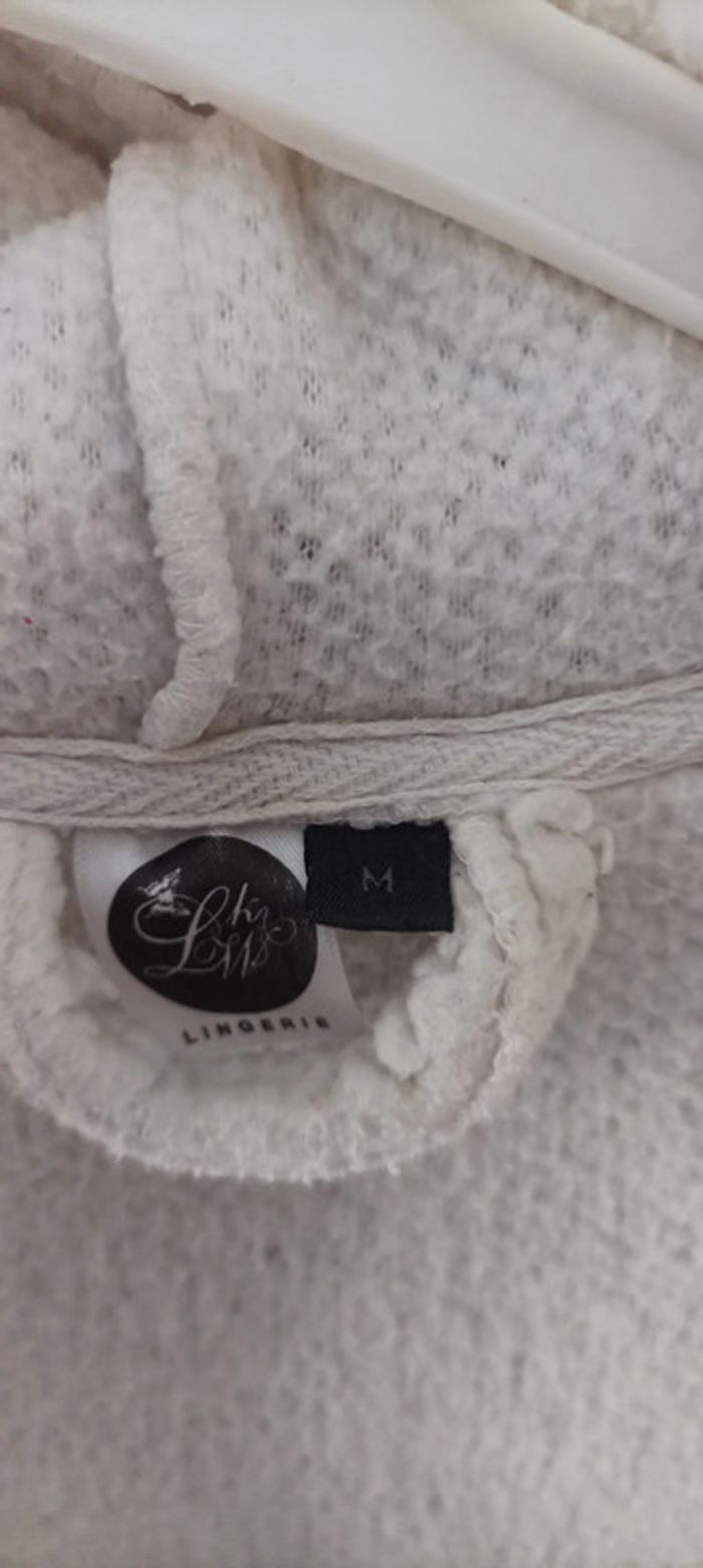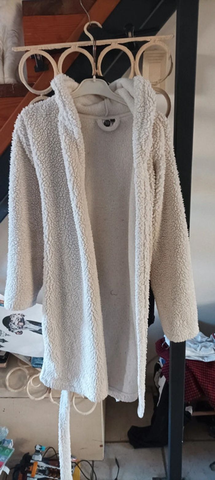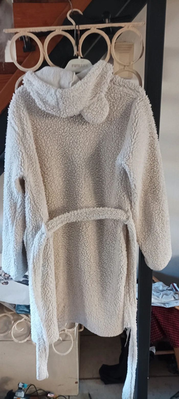 Peignoir pelucheux femme blanc taille M porté normalement très bon état avec capuche manches longues coton très doux (visiter mon site les prix sont abordables et négociable)