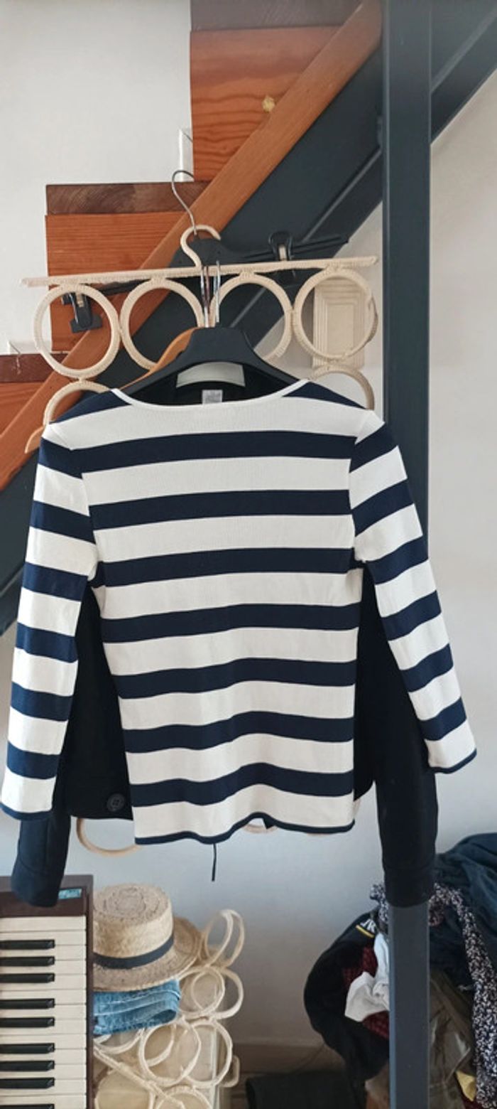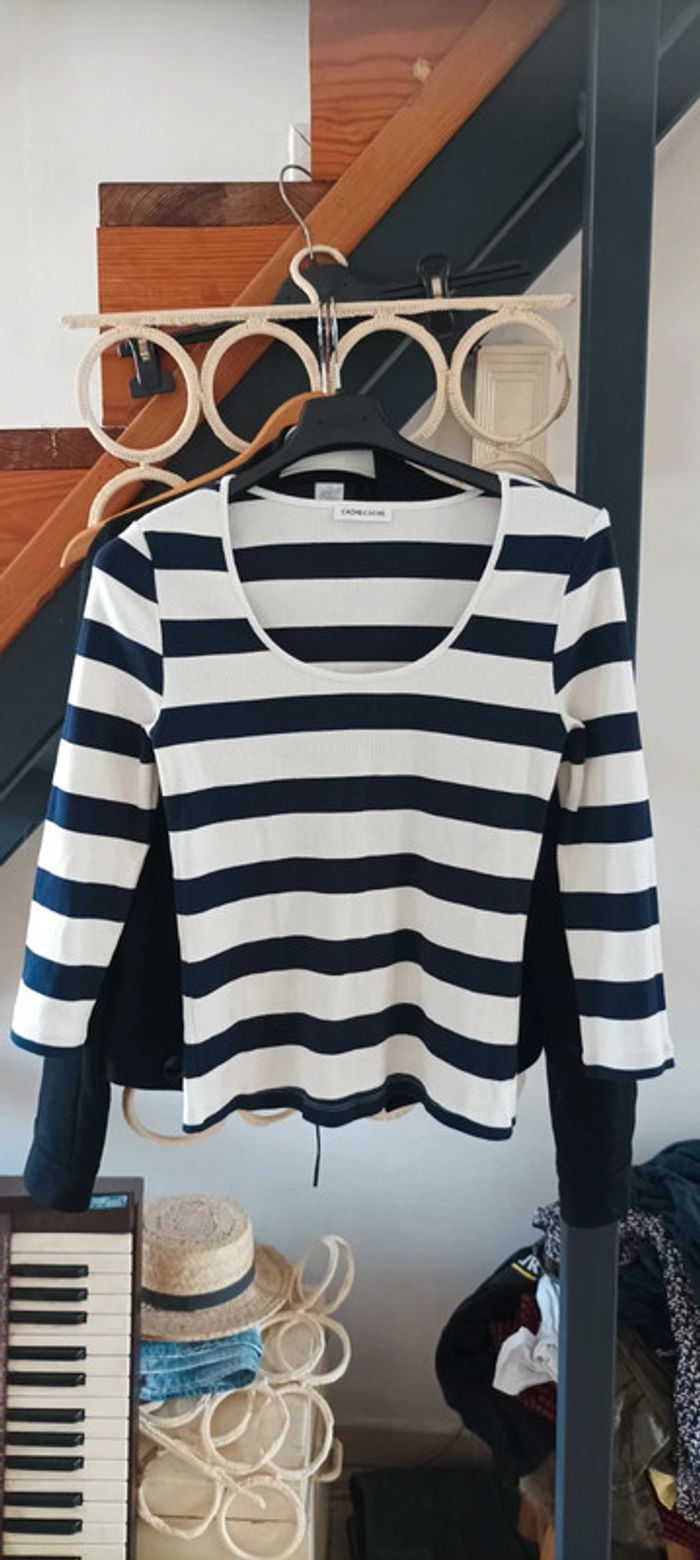 Pull femme léger toutes saisons type marinière taille S bleu marine et blanc Col arrondi très bon état porté normalement marque cache cache (visiter mon site les prix sont abordables et négociable)
