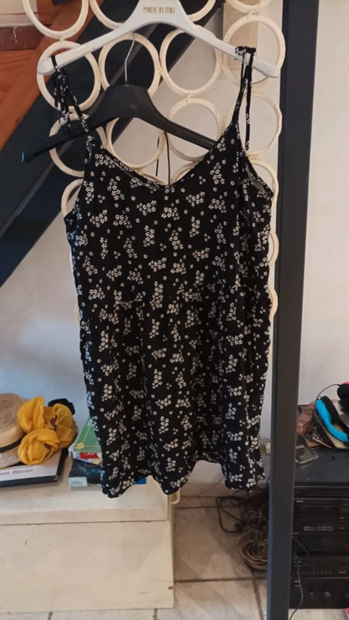 Robe courte femme de couleur noire fleurie largeur sous épaule 44/45 H bas à l'attache 84 cm de marque autres porté normalement très bon état (visiter mon site les prix sont abordables et négociable)