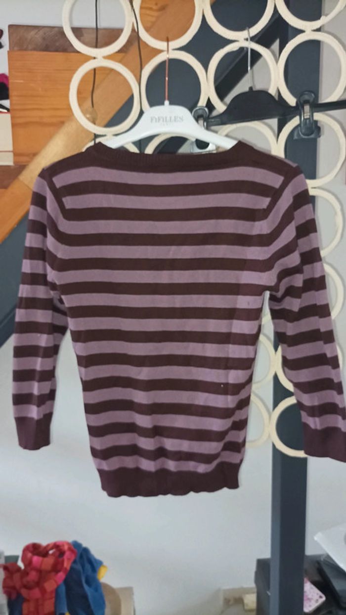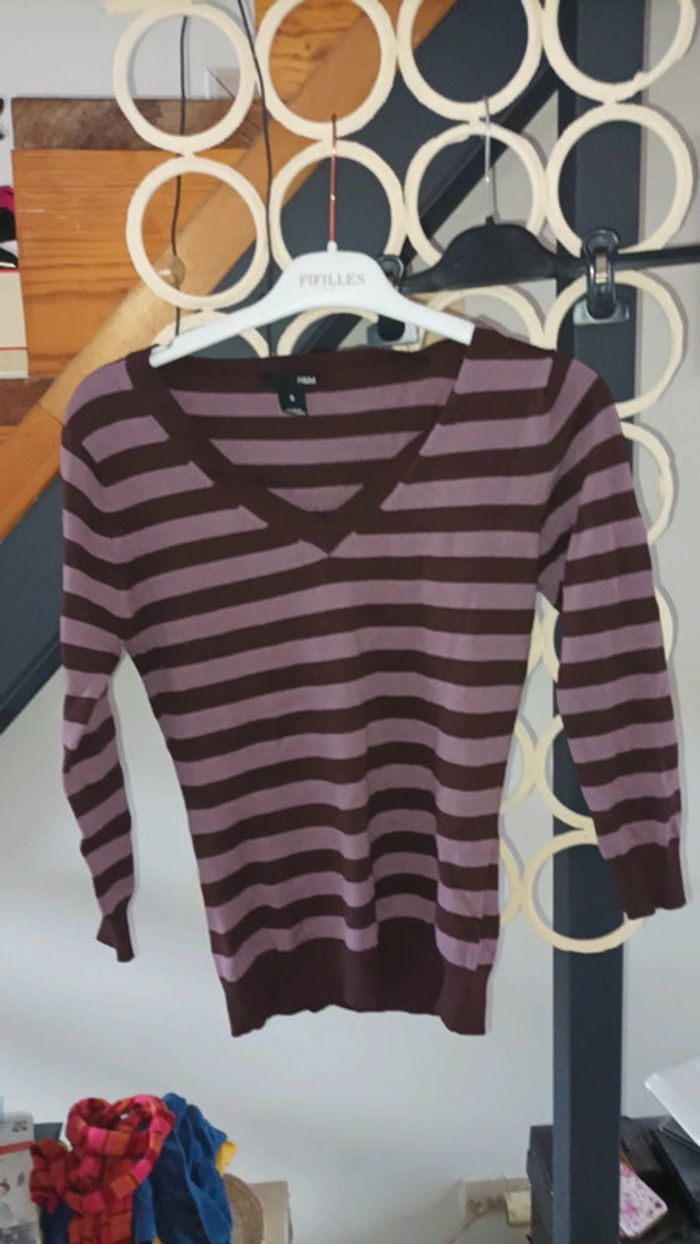 Pull acrylique et laine femme rayures violet taille S avec manches et Col ouvert très bon état porté normalement (visiter mon site les prix sont abordables et négociable)