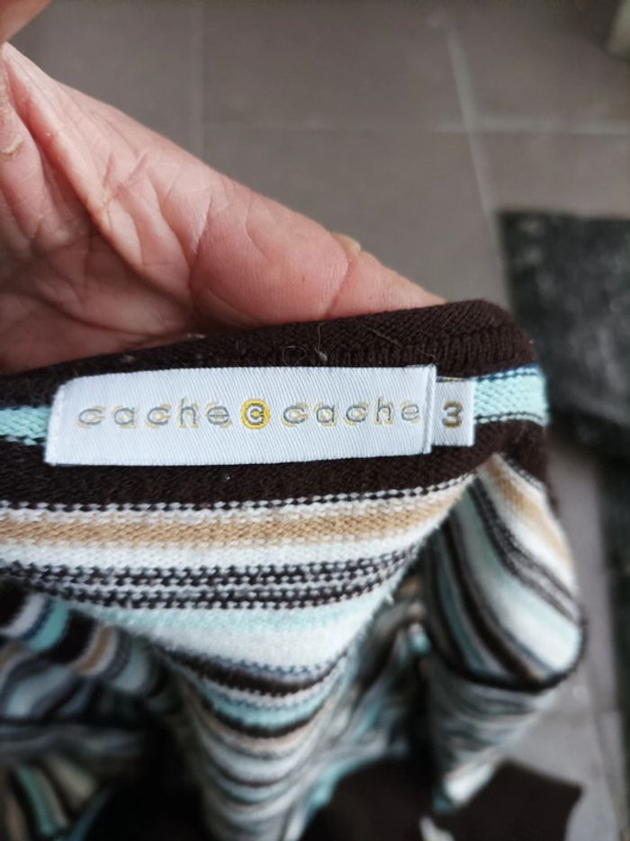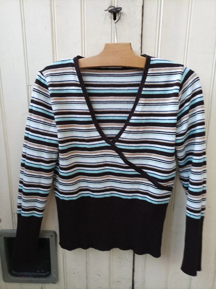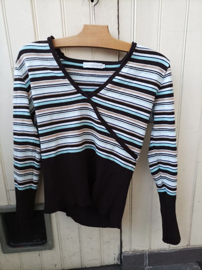 Pull manches longues décolleté avec rayures noires bleuets beige, très bien pour femme