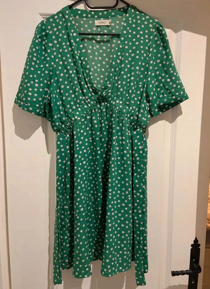 🔝 Robe courte manches courtes Senes verte a pois blancs décolleté en v en polyester et viscose - photo numéro 1