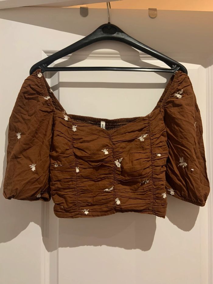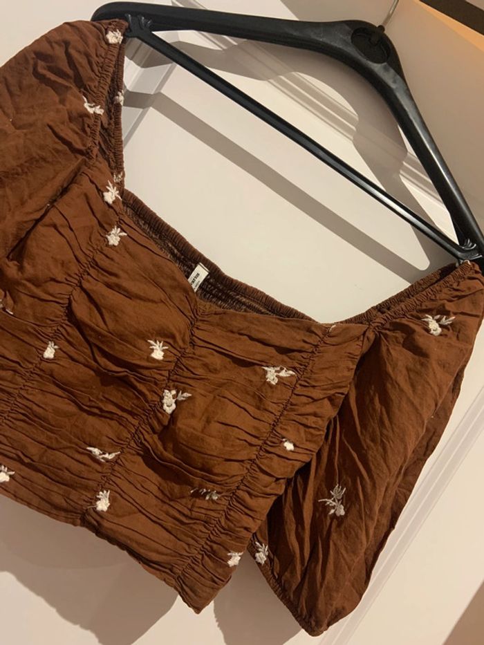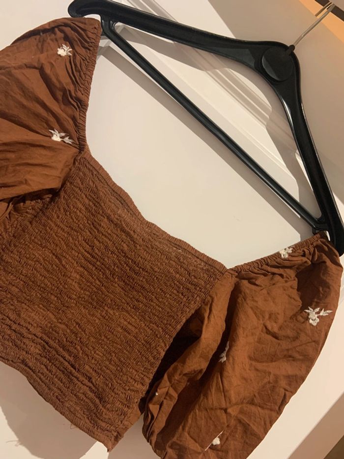 🔝 Crop top Stradivarius marron avec fleurs blanches brodées col bardot manches ballon taille S 36 - photo numéro 5