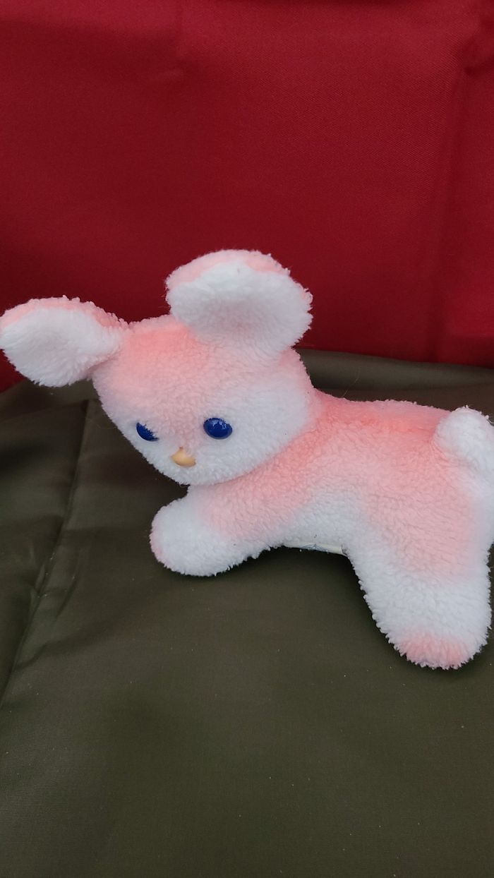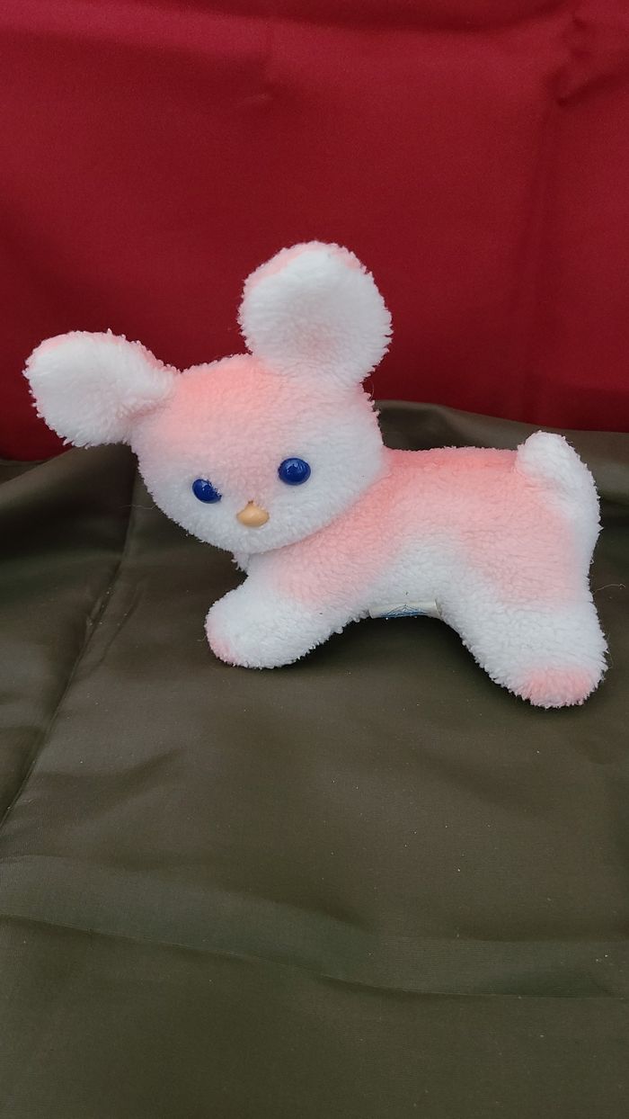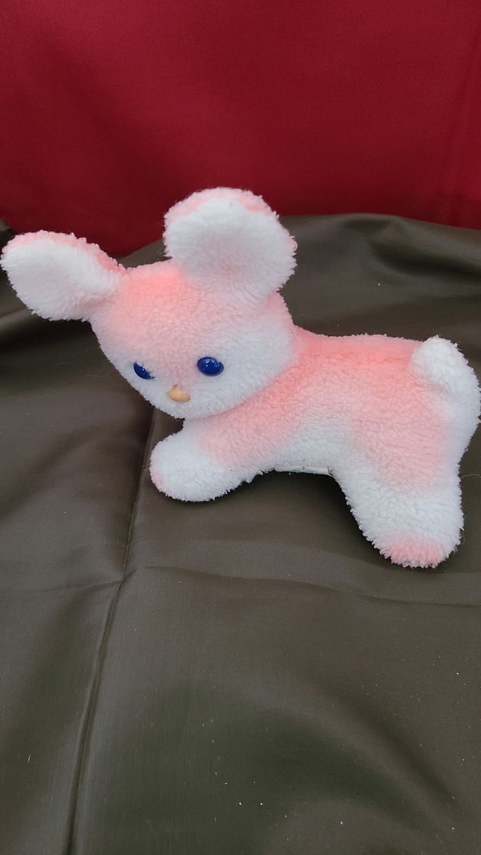Peluche lapin PASTEL grelot couché Yeux bleus vintage rose et blanc 17 cm - photo numéro 1