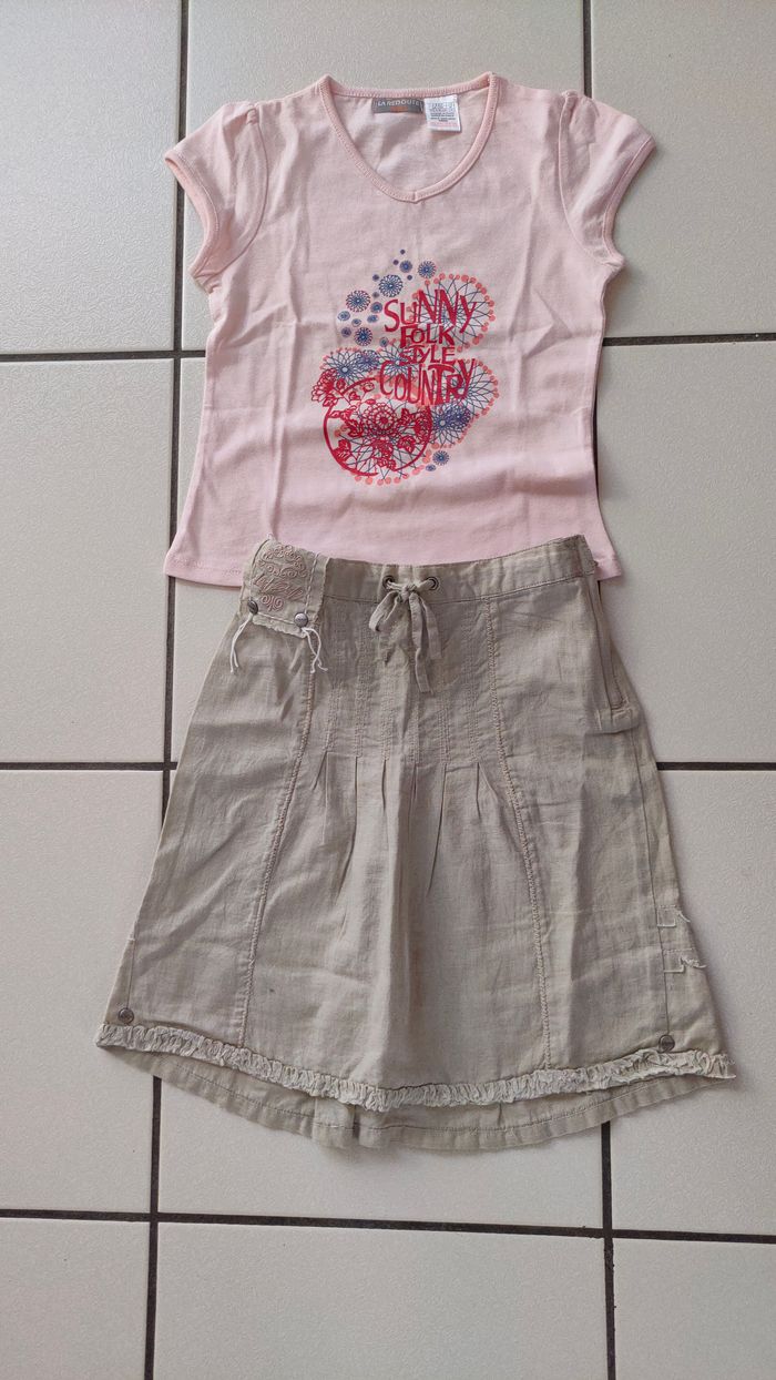 ensemble fille jupe DDP + tee shirt NEUF rose La Redoute taille 6 ans *Jupe écru taille 5 ans (taille grand comme du 6 ans)marque : DDP Coton en très bon état effet mode plus long à l'arrière que devant composition : 45% coton et 55% lin.lavage : 30 degrés. * tee shirt col V rose avec sérigraphie devant taille : 6 ans. marque : LA REDOUTE KIDS composition : 100%coton. lavage : 40 degrès NEUF