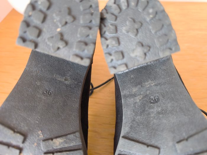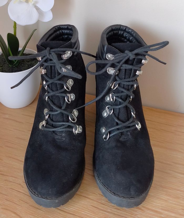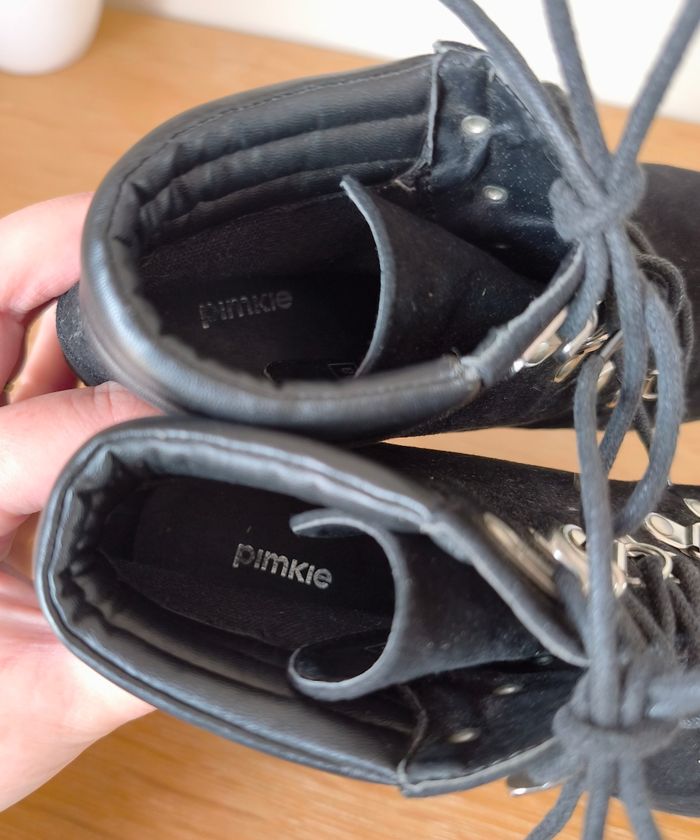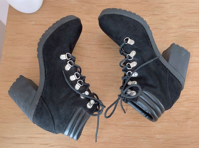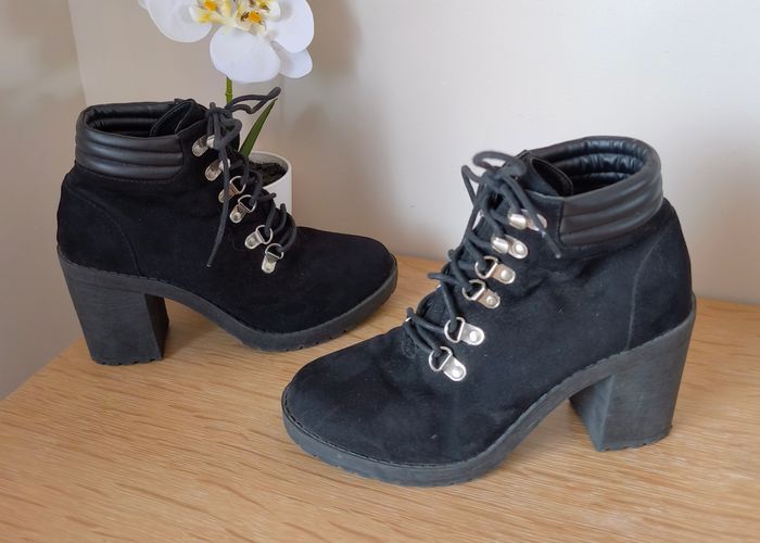 Bottines de la marque PIMKIE - Noir - Matière : suédine et synthétique - Ouverture par lacets et crochets - Talon : 7 cm - Hauteur total : 17 cm - Pointure : 36 ❌ Excellent état comme le montre les photos #kat02600chaussurefemme36 #bottinefemme36 #pimkie #bottinepimkie36 #chaussurefemme36