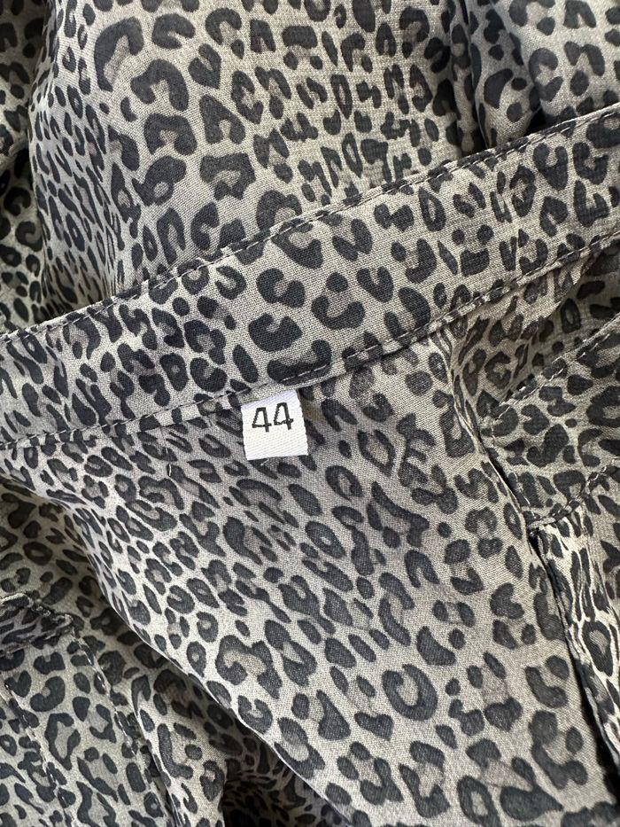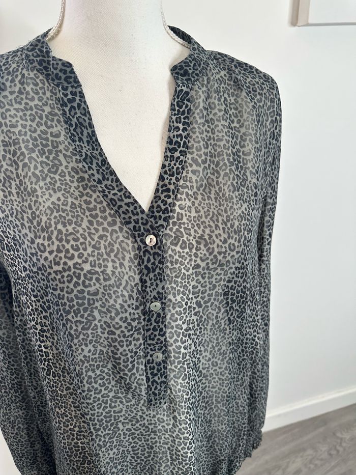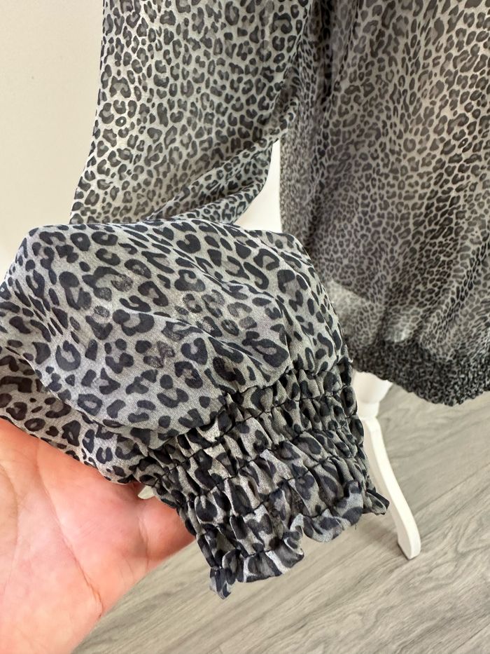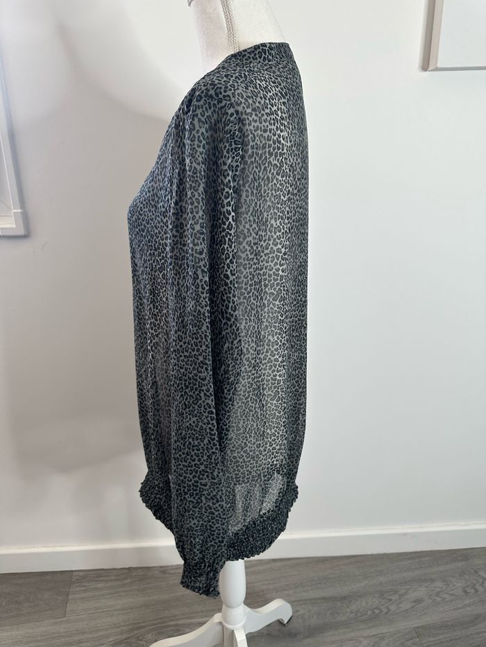 Blouse - Excellent état - Taille 44 équivalent XXL - Imprimés léopard - Manches longues - Gris marron noir, sous tons vert - Élastiques aux extrémités - Boutons au niveau du col - Tissus transparent - Pas d’étiquette de matière