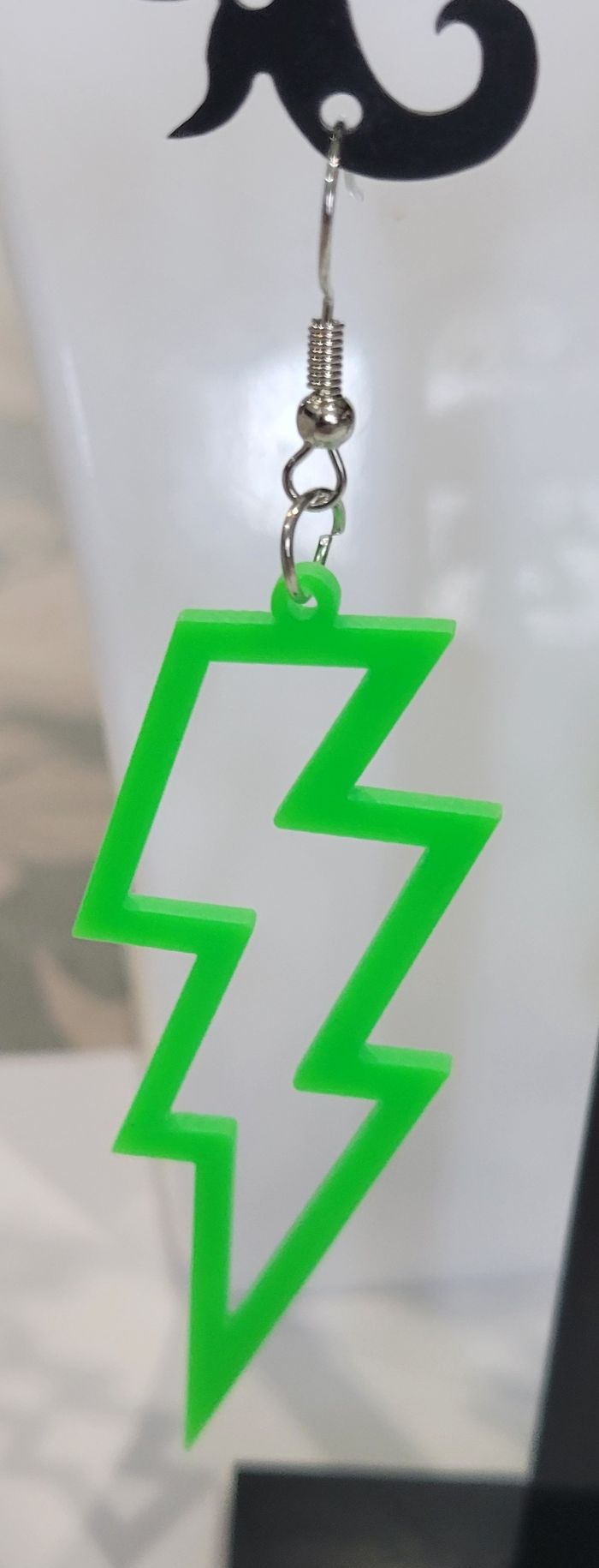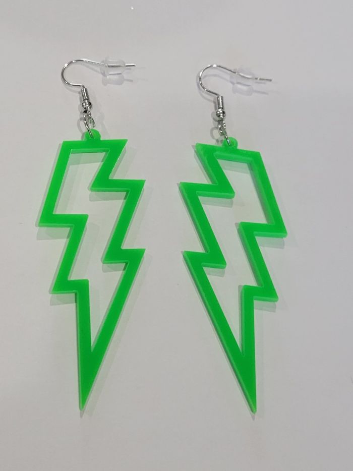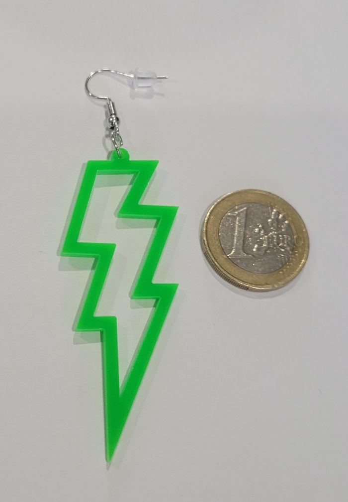 BOUCLES D'OREILLES ECLAIR VERT FLUO DISCO ANNEE 80 ! NEUF! Paire de boucles d'oreilles motif eclair vert fluo Hauteur : 9 cms. N'hésitez pas à regarder mes autres ventes. Envoi rapide et soigné.