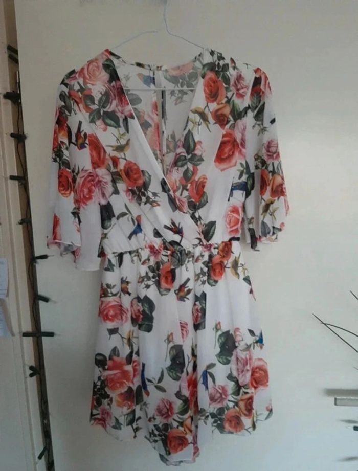 Magnifique combishort décolleté en V. Élastique à la taille. Petites manches. Taille unique. Doublure au short. Blanche avec des fleurs. Je la vends au prix de 25 euros. #TailleUniquemarine