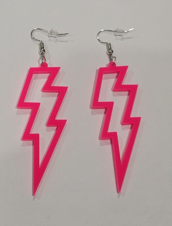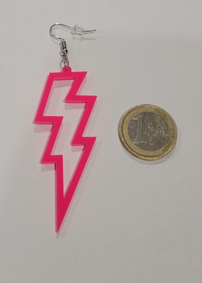 BOUCLES D'OREILLES ECLAIR ROSE FLUO DISCO ANNEE 80 ! NEUF! Paire de boucles d'oreilles motif eclair rose fluo Hauteur : 9 cms. N'hésitez pas à regarder mes autres ventes. Envoi rapide et soigné.