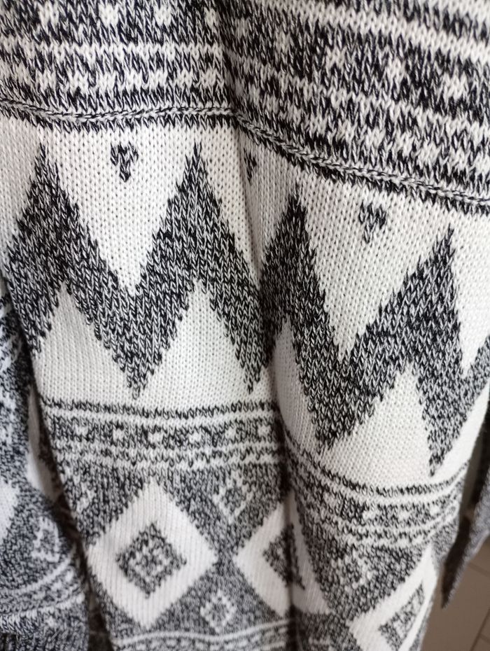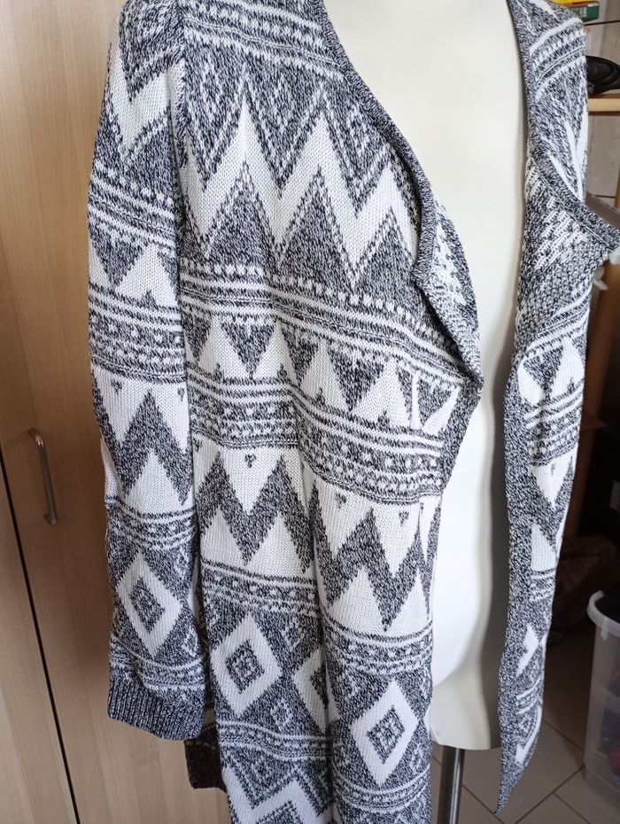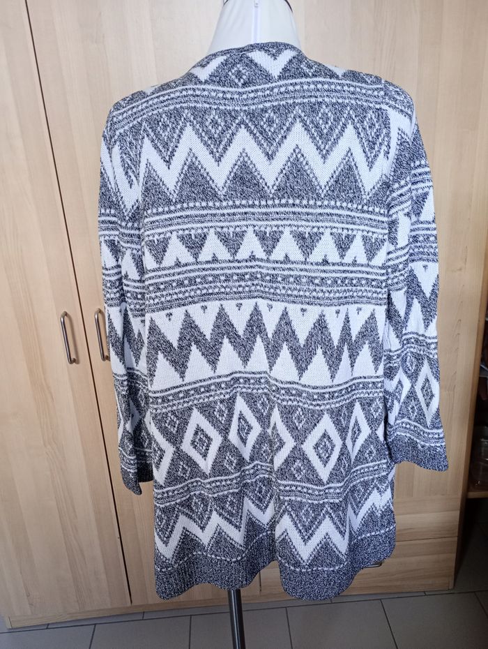 Gilet avec motifs noirs et blancs. Taille : L. Marque : Up2Fashion. Longueur : 80 cm Largeur entre aisselles fermé : 55 cm Longueur manches : 64 cm Très bon état.