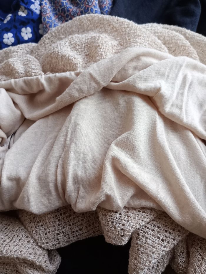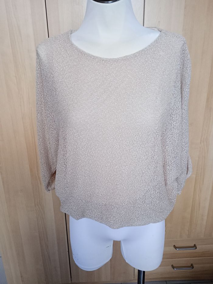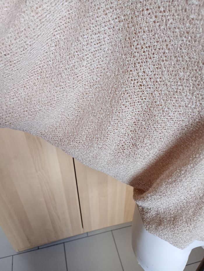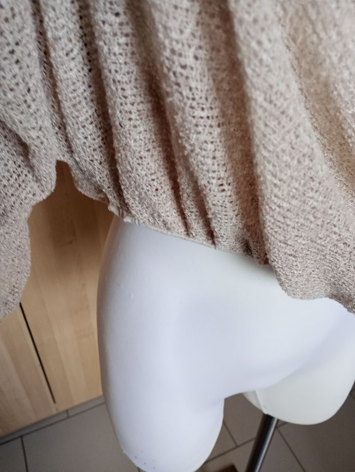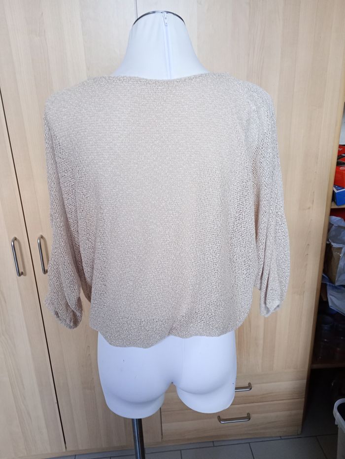 Blouse fluide, doublée d'un débardeur, beige. Elastique à la taille et au bord des manches. Pas de taille, pas de marque. Doit correspondre à un M-L. Longueur : 56 cm. Largeur : 42 cm. Etat impeccable, portée une seule fois.