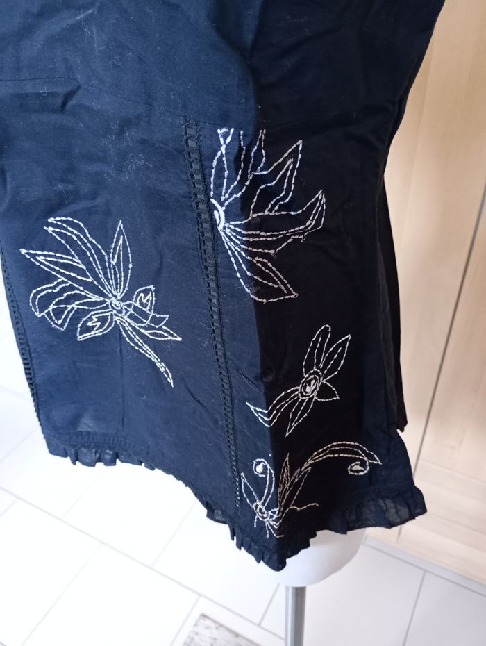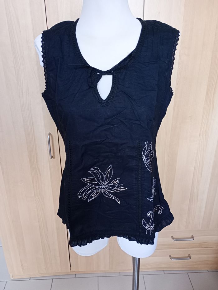 Débardeur noir avec broderies. Avec petite tirette sur le côté. Taille : 40 F/B Marque : Casa Blanca (Charles Voegele). Longueur : 67 cm Largeur entre aisselles : 48 cm Très bon état.