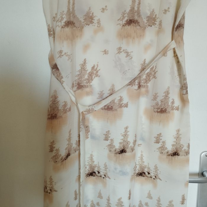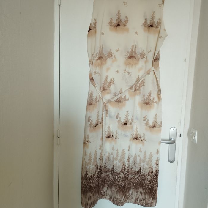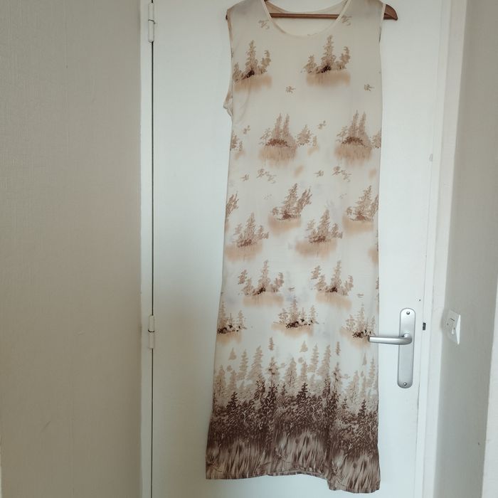 Robe longue sans manche, comporte une ceinture avant, arrière ou sur le côté ! Coloris crème, beige et marron. Longueur 1m27, Aisselle à Aisselle 60cm.