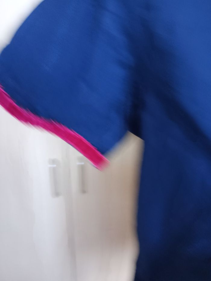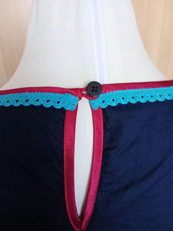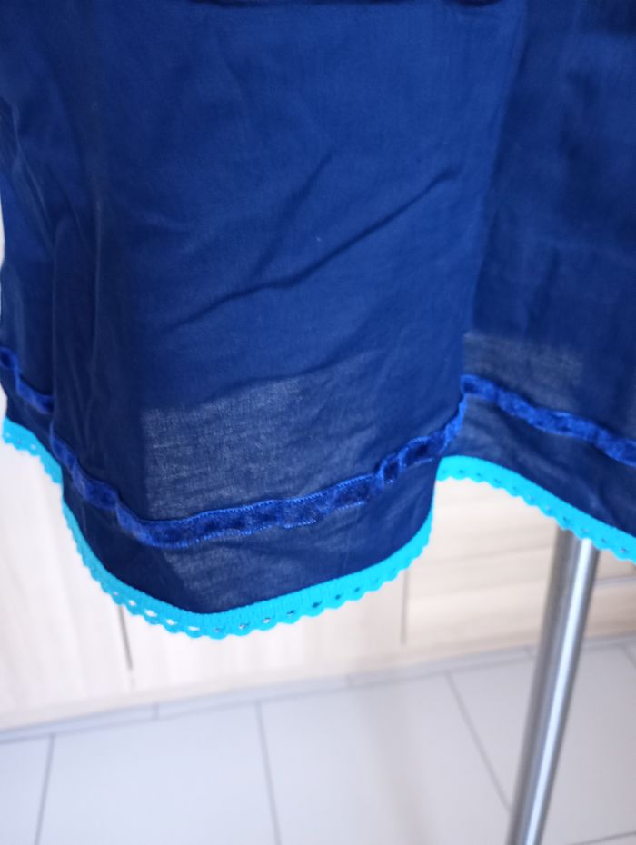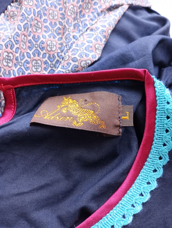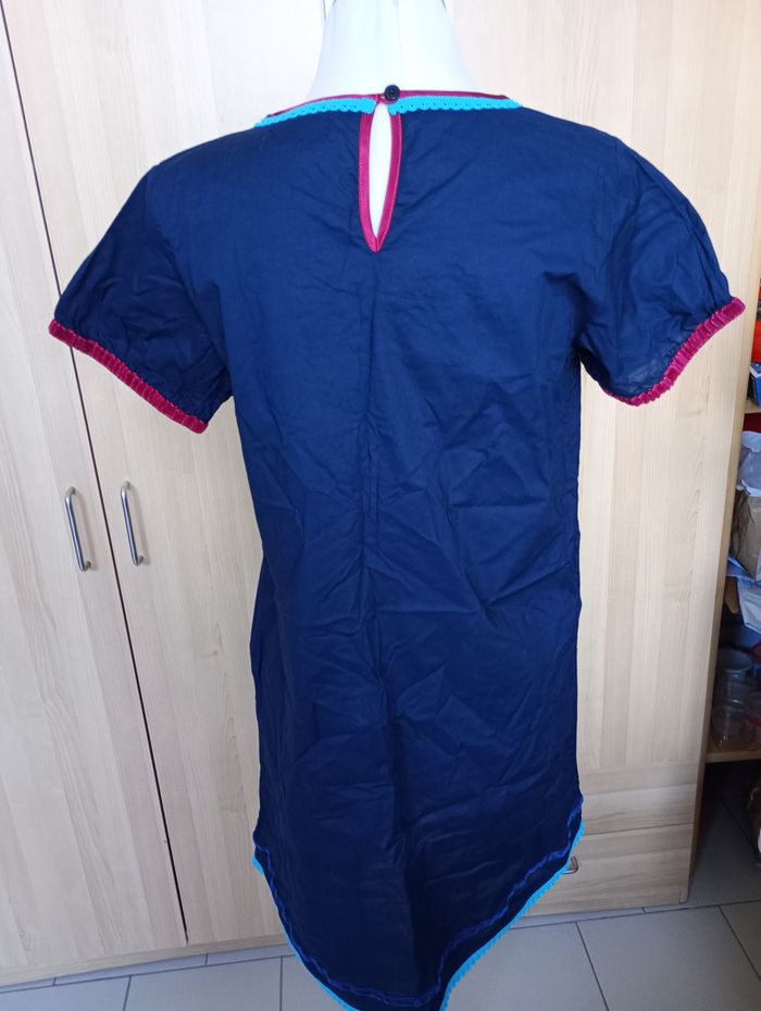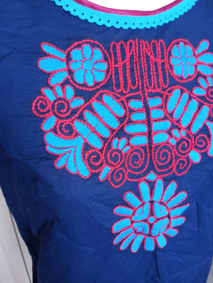 Robe ou tunique bleu marine avec broderies. Liseré de velours au bord des manches et sur le bas. Taille : L. Marque : Adxen. Longueur : 85 cm Largeur entre aisselles : 48 cm Très bon état.
