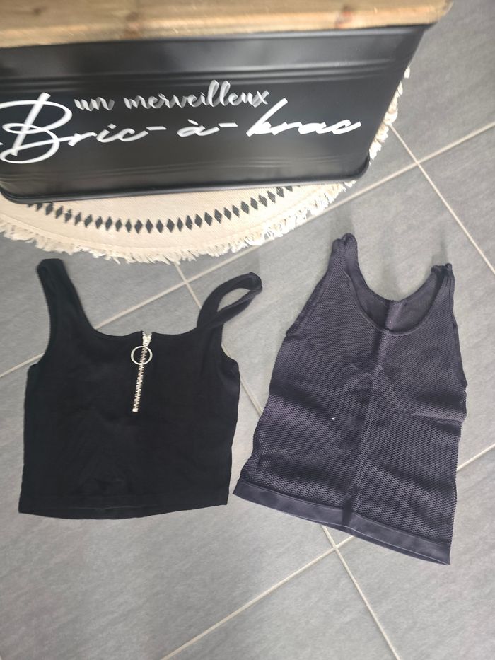 Bonjour 👋 Je vend ce : 👉 Lot de deux débardeur cœurs taille S - un noir jennyfer - un noir transparent Maison 🏠 non fumeur et sans animaux