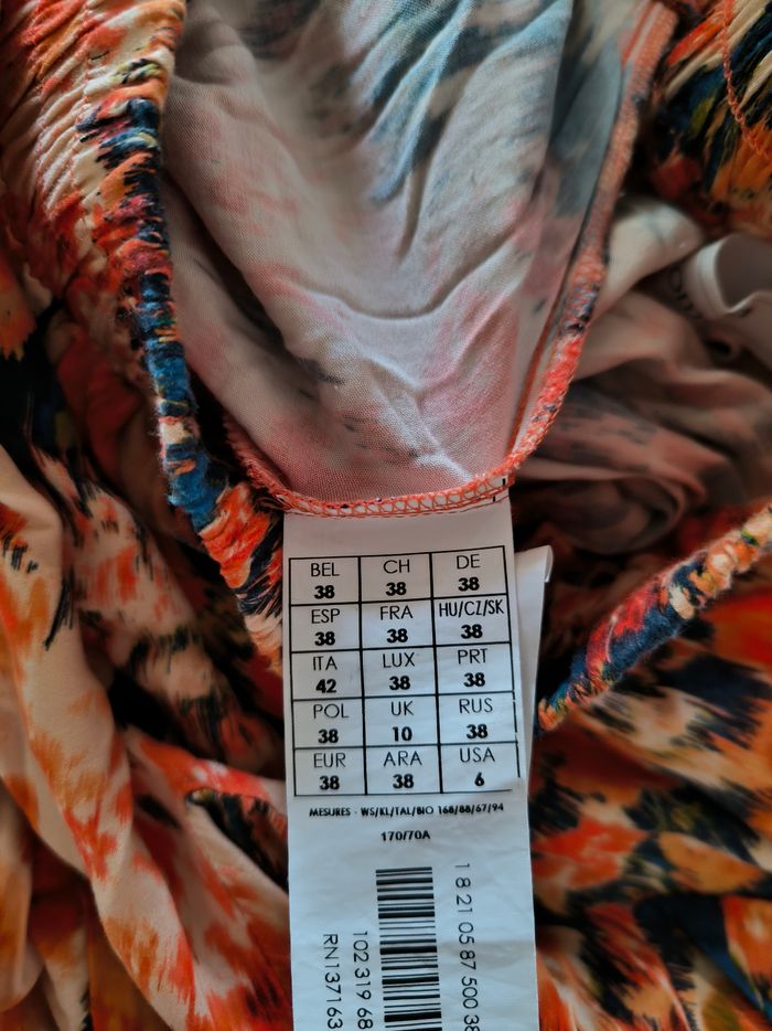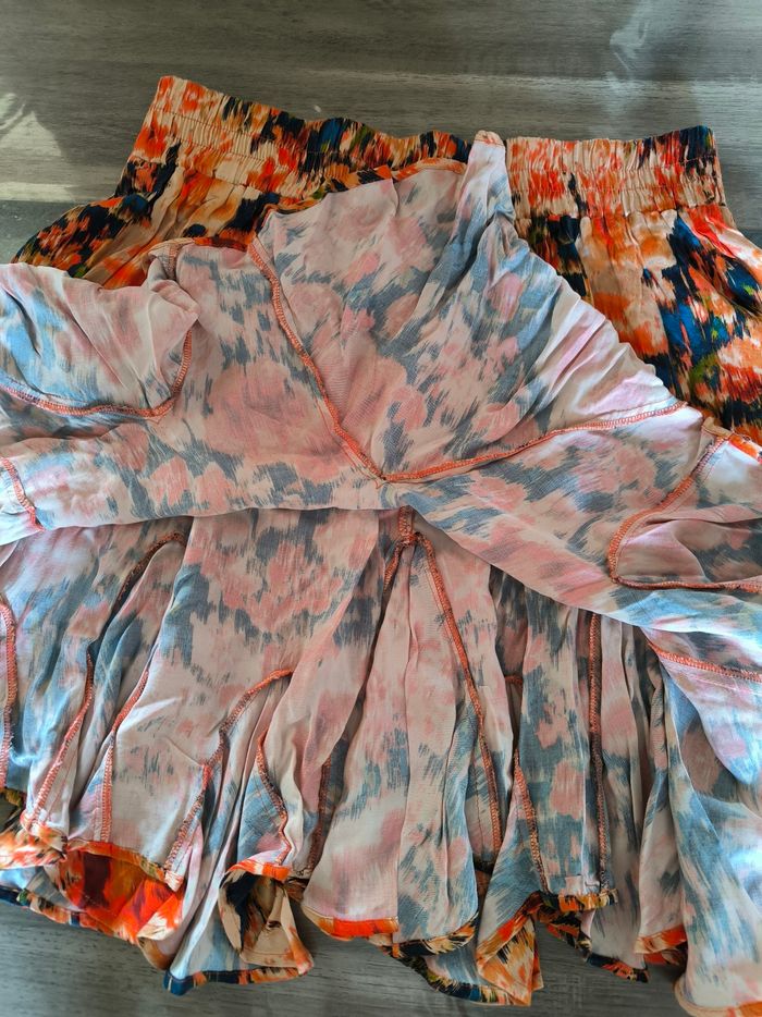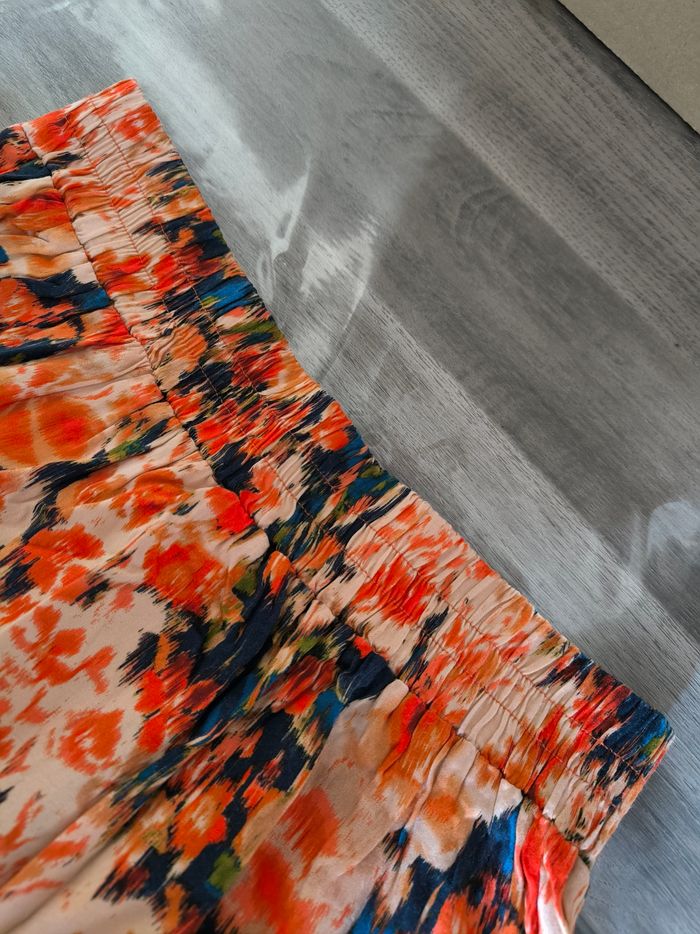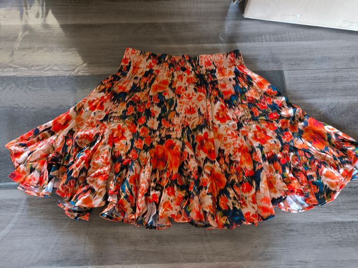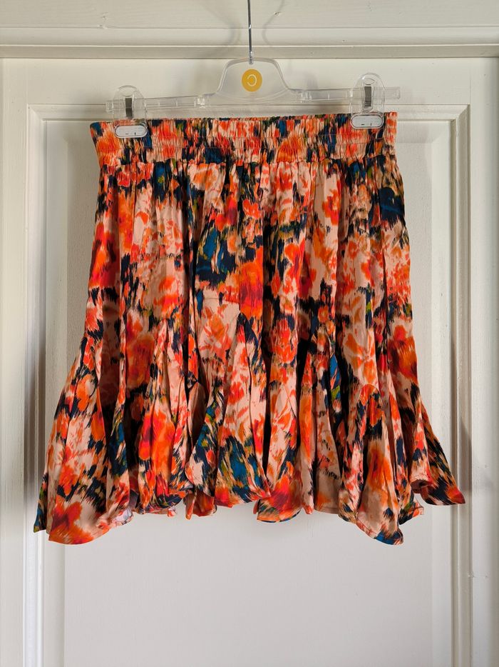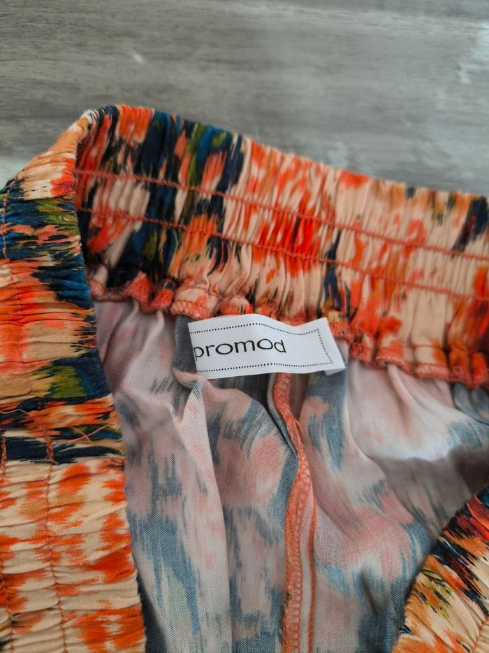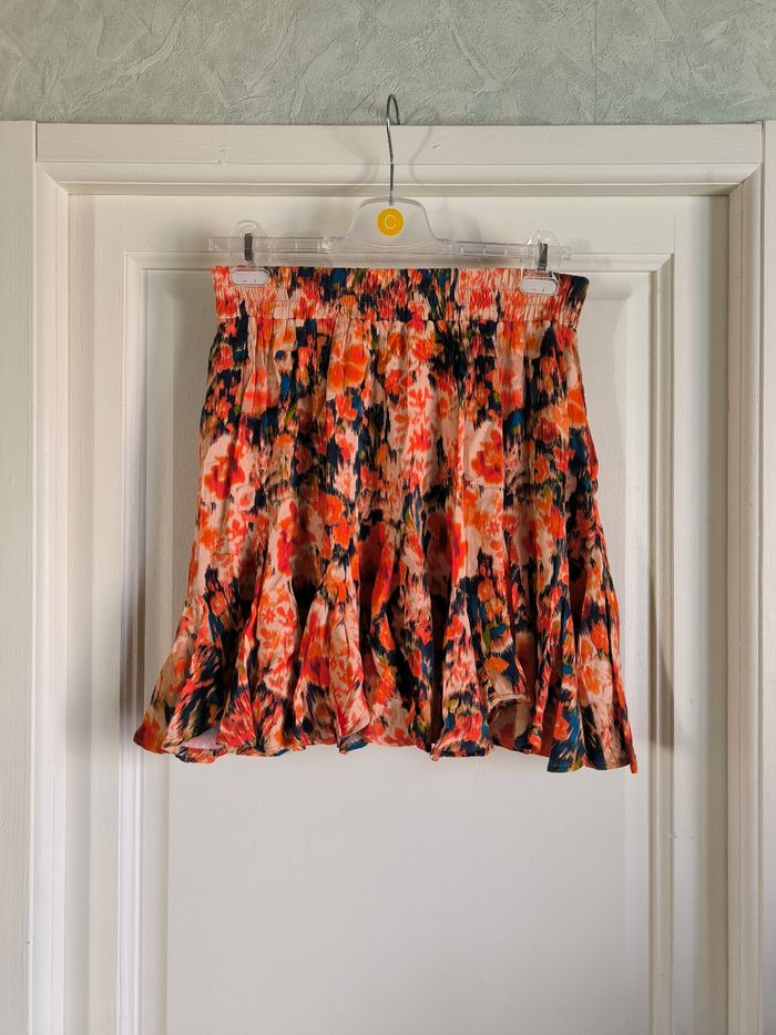 Jupe courte Marque Promod Taille 38 • Coloris orange, marine, vert • Imprimés • Taille élastique • Volants • Tissu fin, fluide Largeur taille non étirée : 34 cm Largeur taille étirée au maximum : 65 cm Longueur totale : 46 cm Comme neuve #evelyne_taille_38