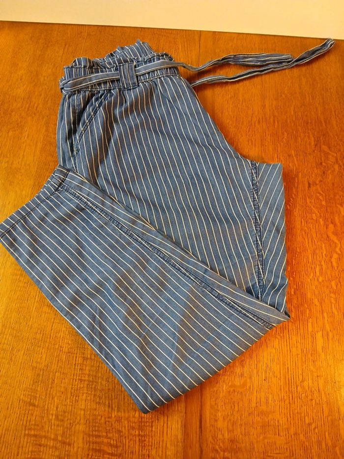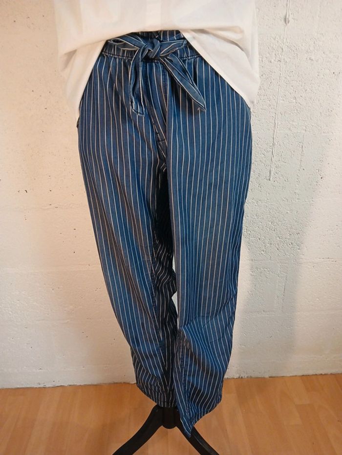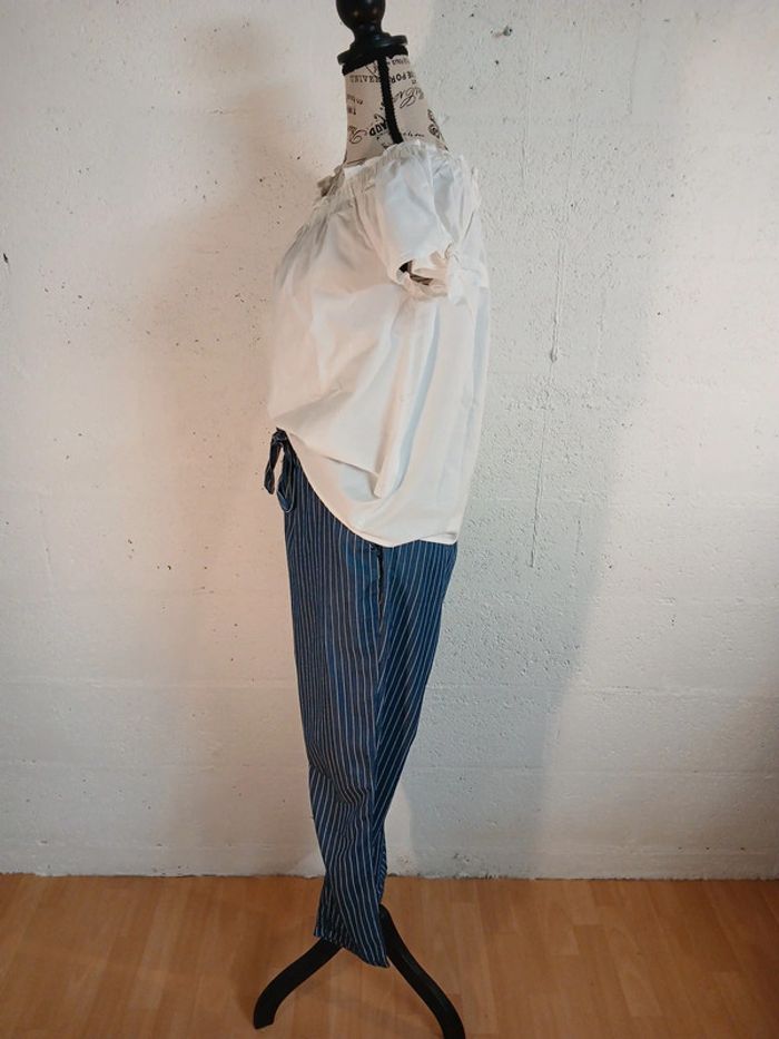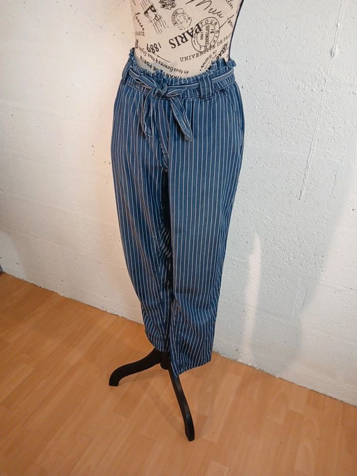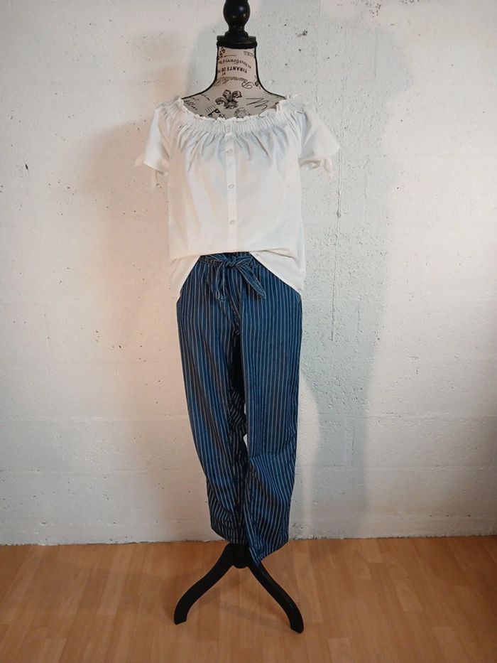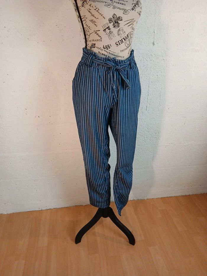 Pantalon bleu et blanc Marque YESSICA Taille elastique Ceinture en tissu assortie Porte assez souvent, qq traces d usures sur les jambes et au niveau de l entrejambe, donc état satisfaisant Largeur taille a plat 41 cm Longueur dos 95 cm Autres articles à retrouver en vente dans mon dressing : Blouse atmosphère 38 🌈 Pensez au lot afin de limiter les frais de port mais aussi pour faire des économies car les réductions sont actives dès 2 articles 😍 🌈