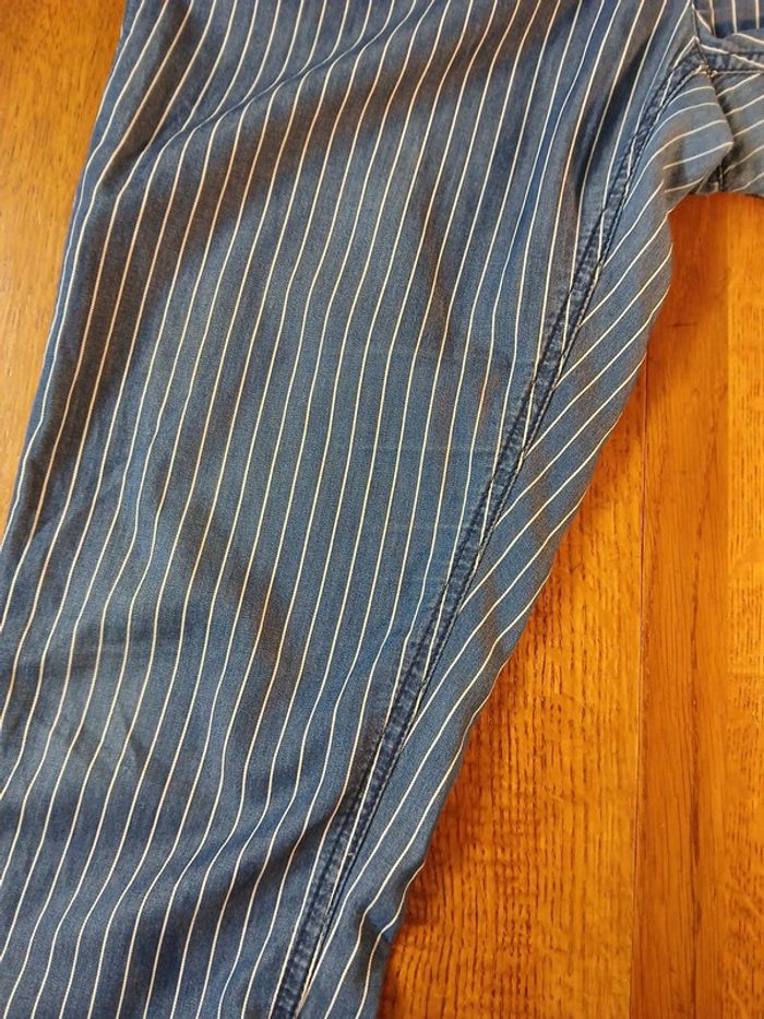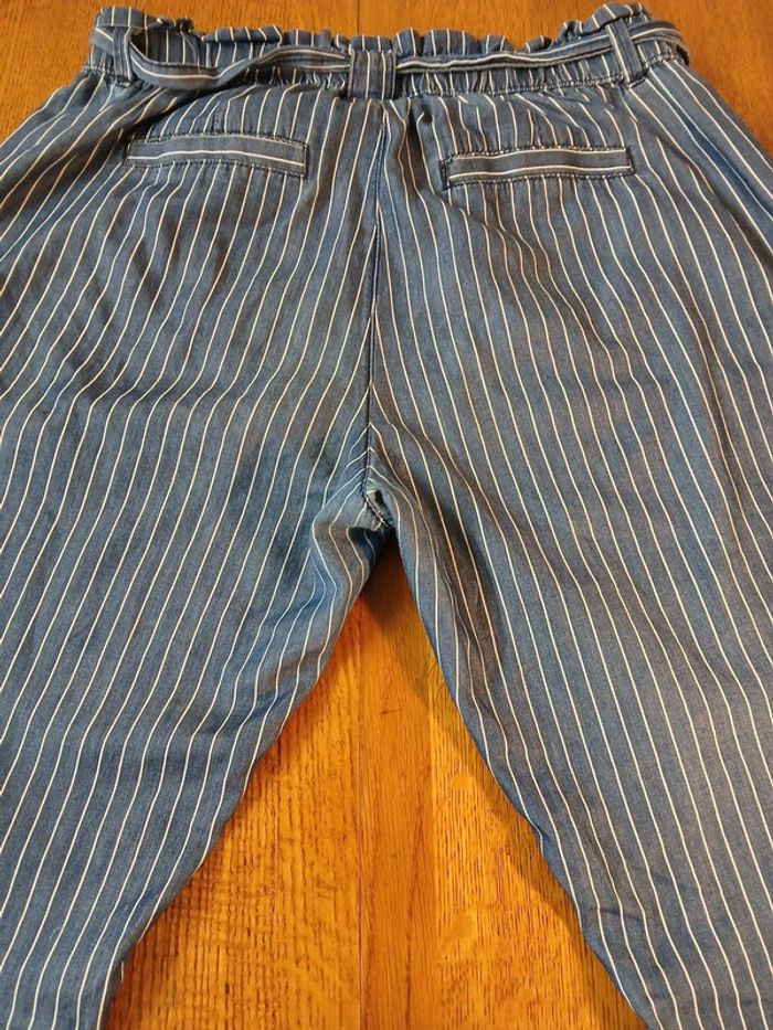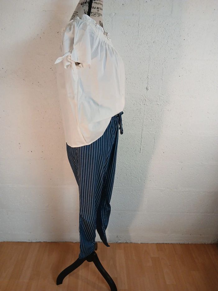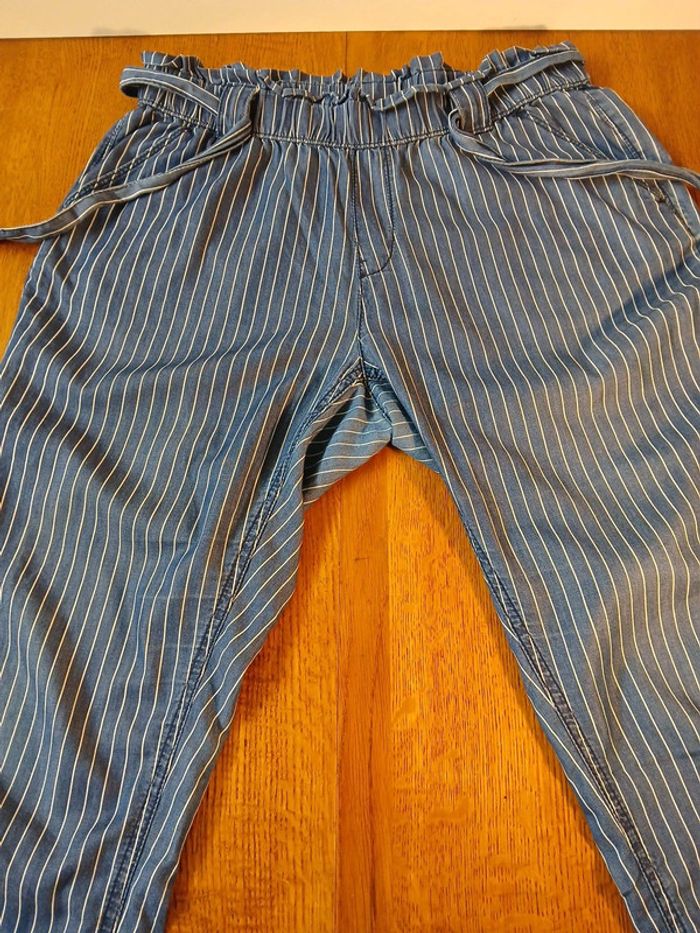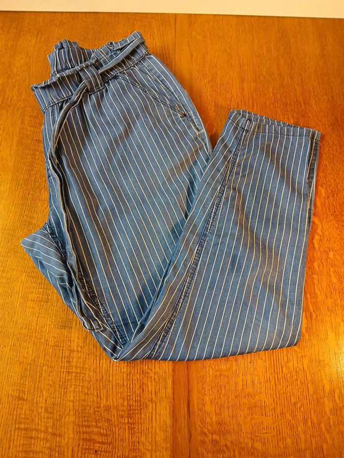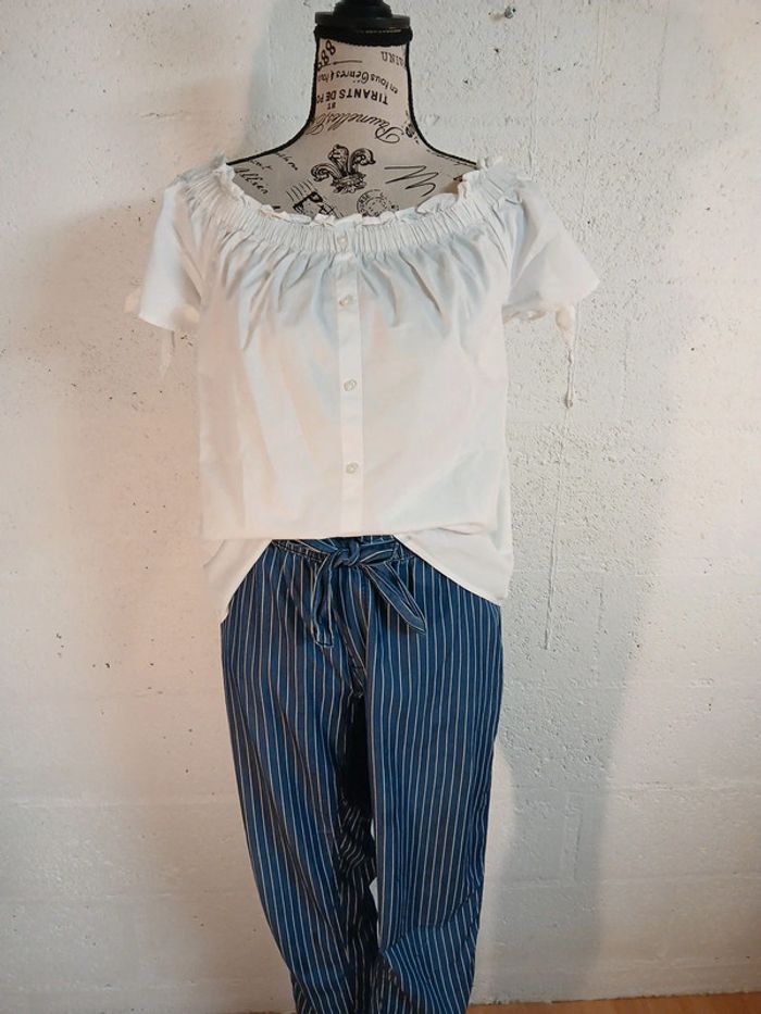 Pantalon bleu et blanc Marque YESSICA Taille elastique Ceinture en tissu assortie Porte assez souvent, qq traces d usures sur les jambes et au niveau de l entrejambe, donc état satisfaisant Largeur taille a plat 41 cm Longueur dos 95 cm Autres articles à retrouver en vente dans mon dressing : Blouse atmosphère 38 🌈 Pensez au lot afin de limiter les frais de port mais aussi pour faire des économies car les réductions sont actives dès 2 articles 😍 🌈