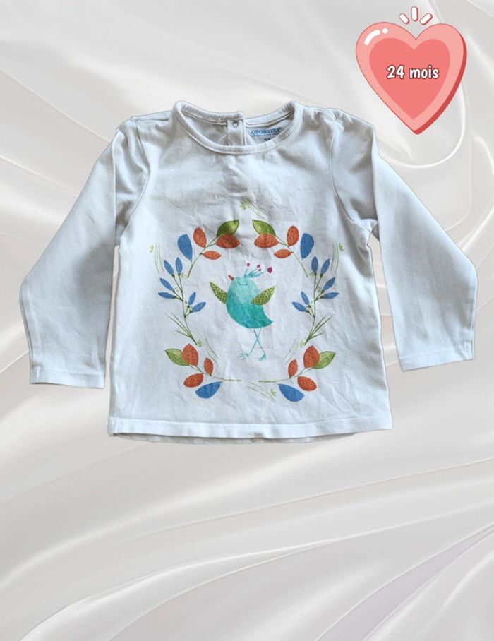 Vends T-shirt / haut manches longues, taille 23 mois, de la marque Orchestra, de couleur blanc avec motif oiseau 🐦. Remise en main propre possible ⚠️ Pas d'envoi par Vinted Go car aucun point dans ma région. Possibilité de faire des lots ☺️ Dressing trié par taille ⬇️ (et voir profil 💕) #Nebchan_fille24mois
