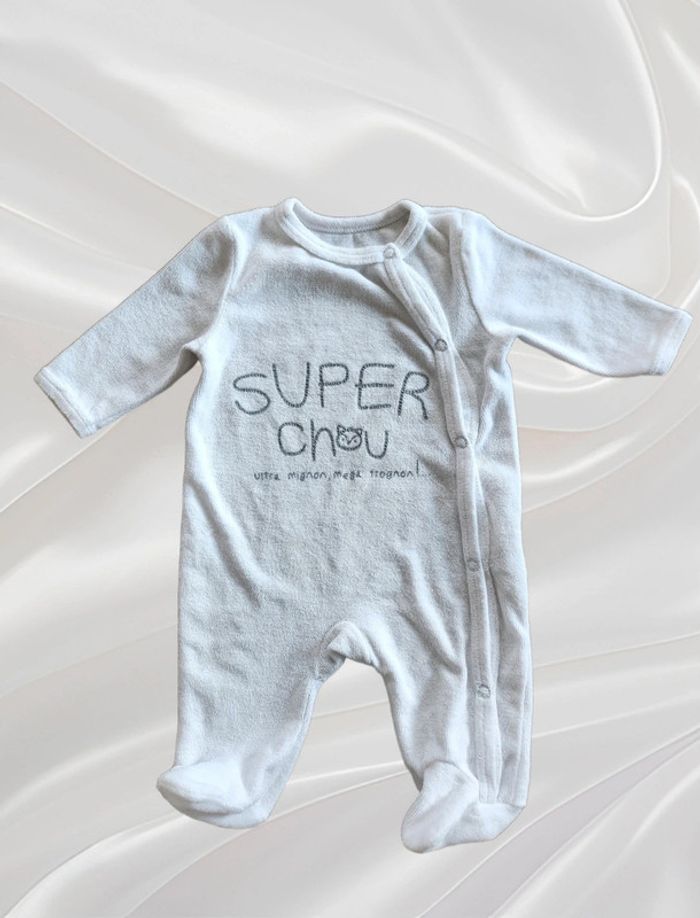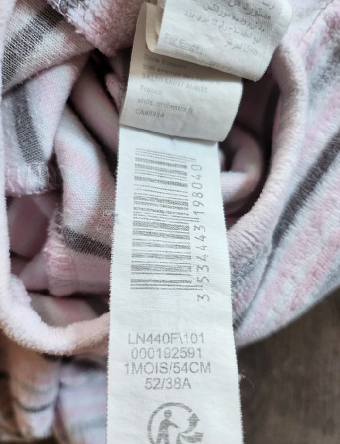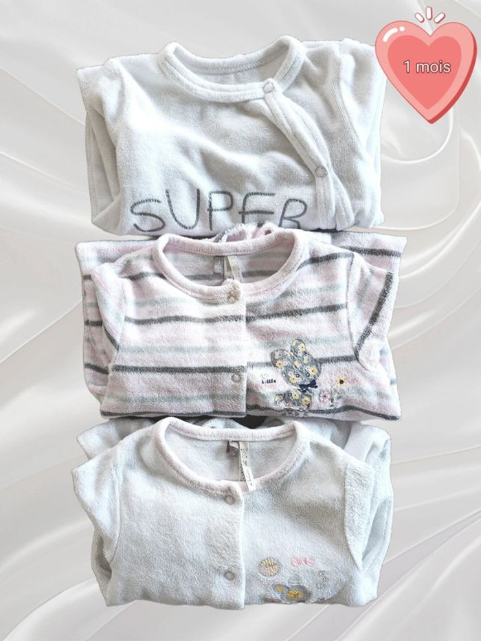 Vends lot de 3 pyjamas / grenouillères, style velours, taille 1 mois, 2 de la marque Orchestra et 1 de la marque Kimadi, 2 de couleurs blancs et 1 de couleur rayée rose, gris et blanc, en coton et polyester. Remise en main propre possible ⚠️ Pas d'envoi par Vinted Go car aucun point dans ma région. #Nebchan_fille1mois