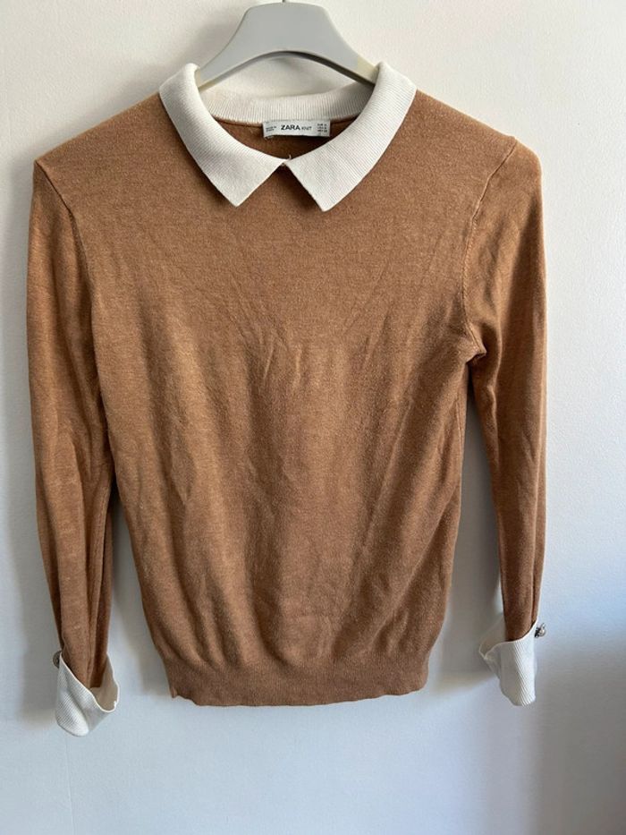 Joli pull beige/marron à col et manches blanc • Zara • taille M