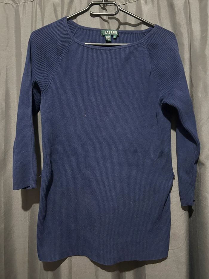 Joli pull manches 3/4 bleu marine • col rond • possibilité d’une ceinture • taille M • Ralph Lauren