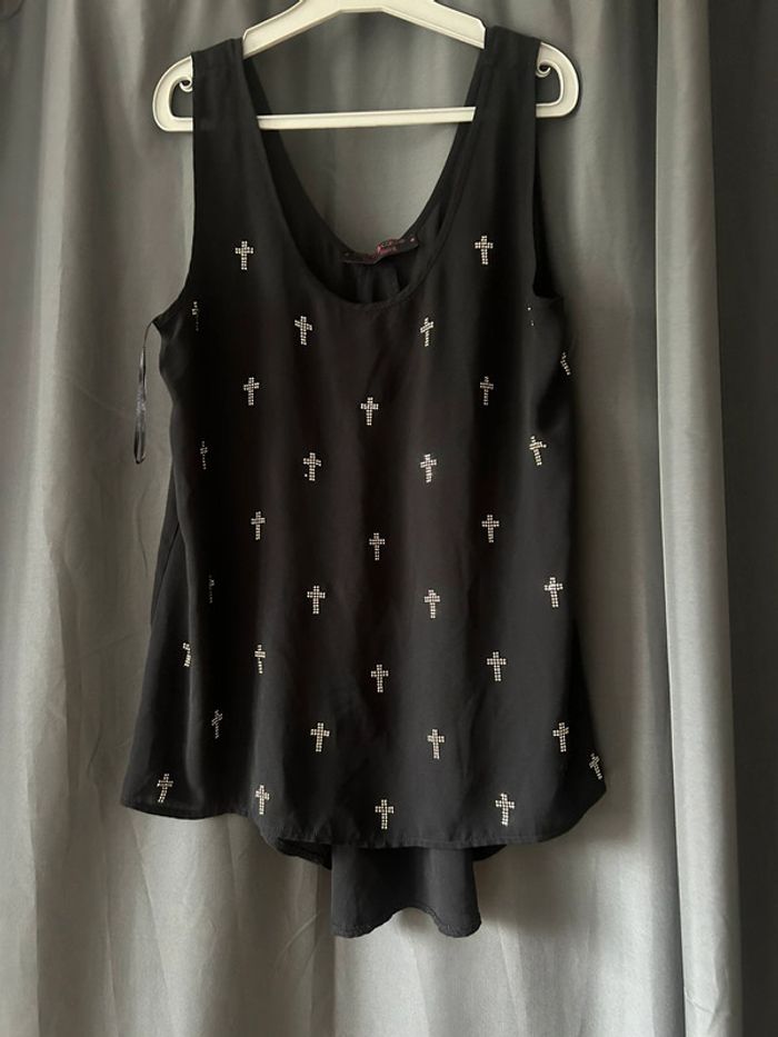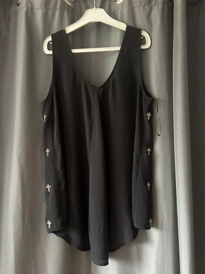 Joli débardeur en voile noir asymétrique motifs croix • cache cache • taille S - photo numéro 1