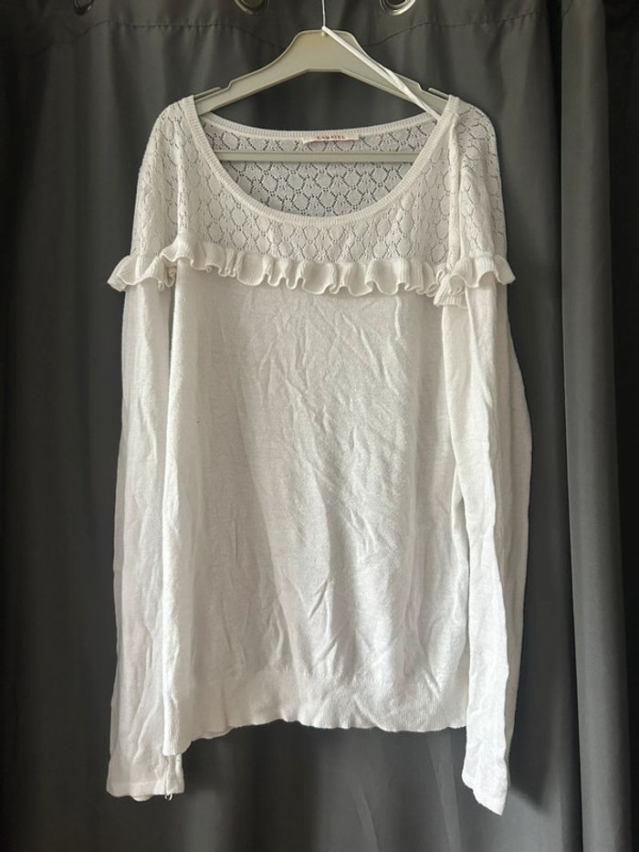 Joli pull léger blanc en dentelle et petits volants • Camaïeu • Taille L - photo numéro 1