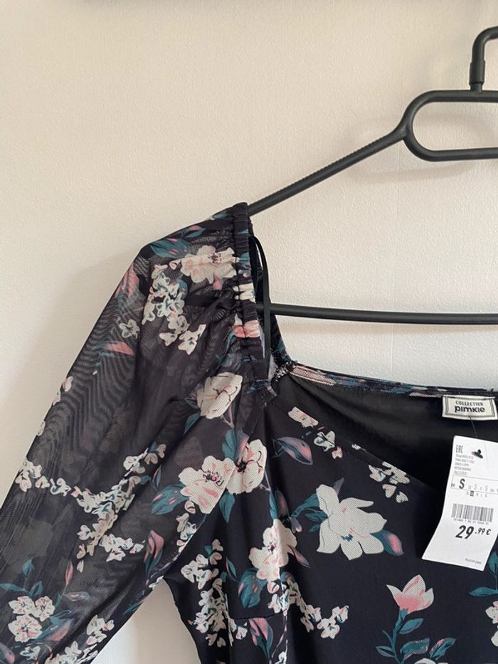 Robe mi-longue à motifs fleuris et étiquette • Pimkie • Taille S Col bardot et manches en voile Neuve avec étiquette #robemilongue #pimkie #taille36 #motifsfleuris