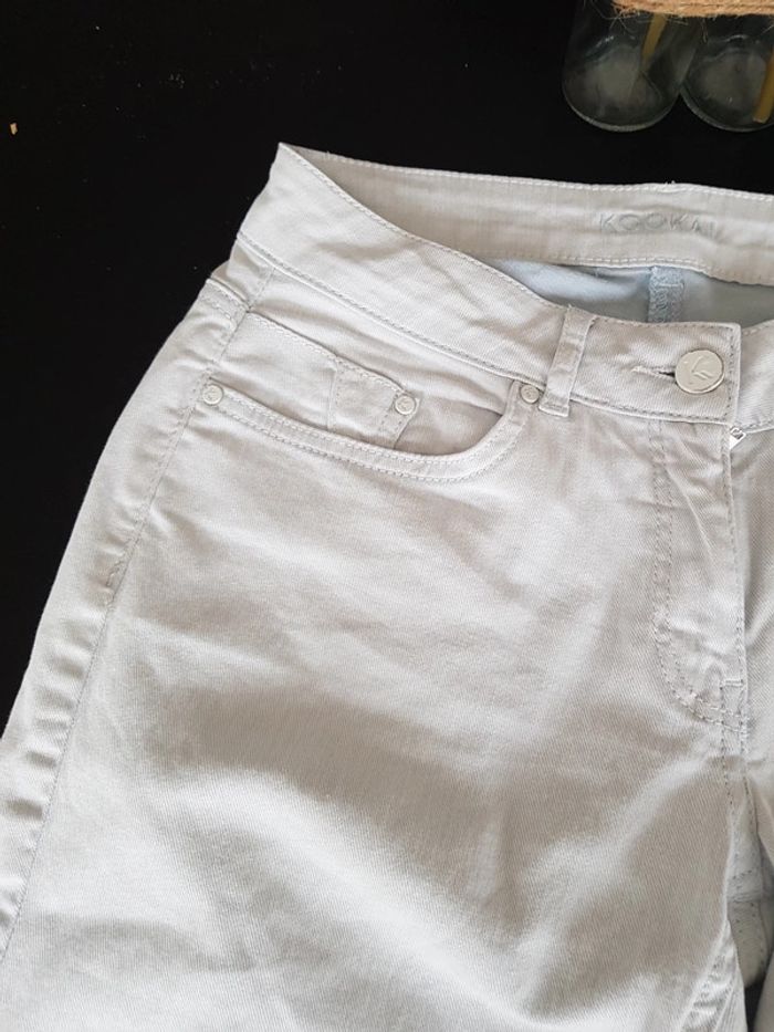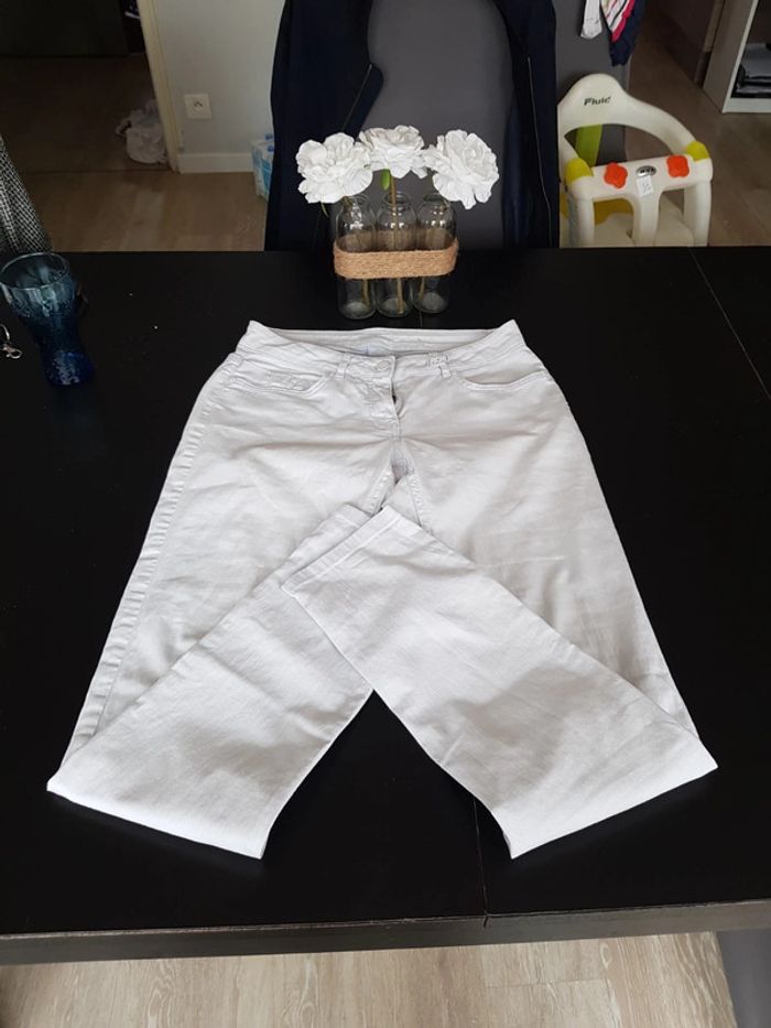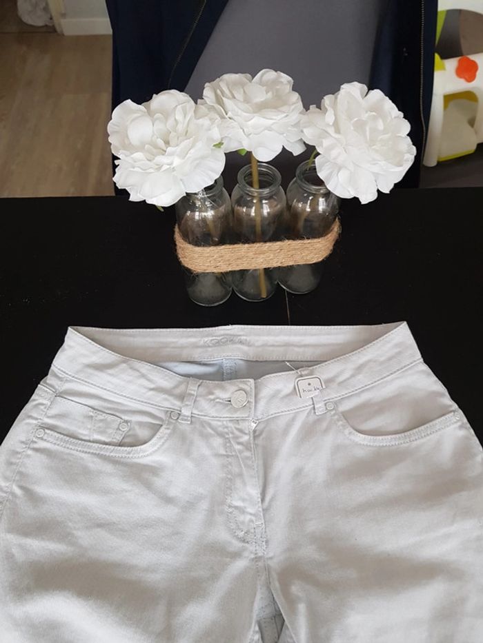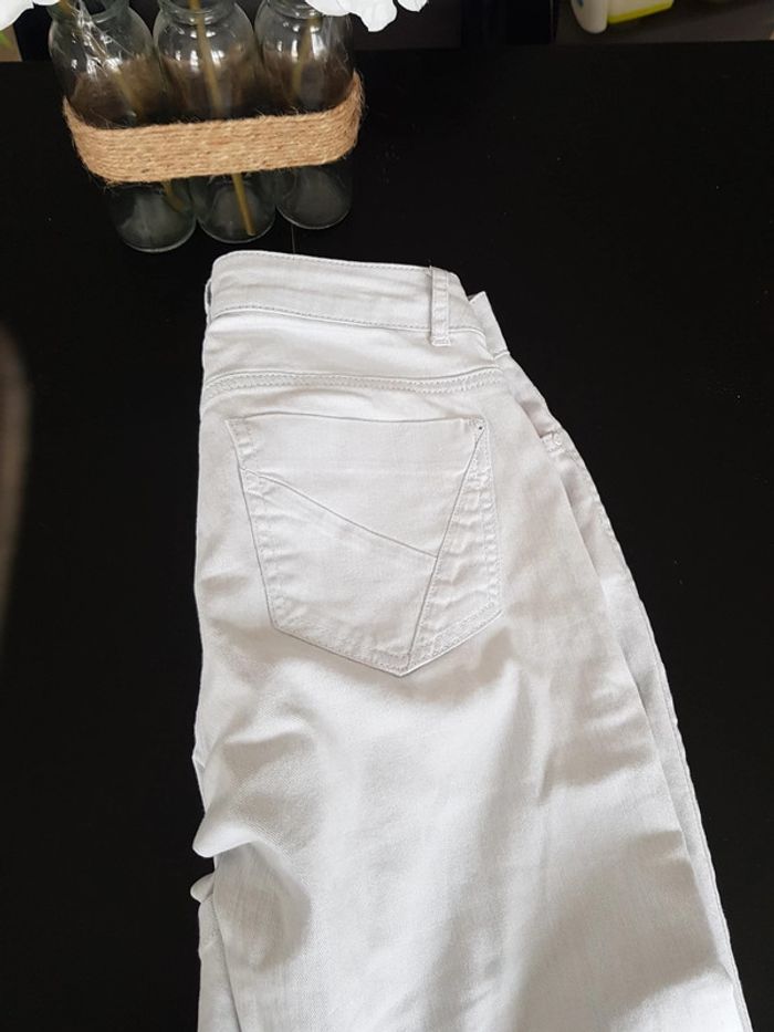 Jean fin bleu tres clair Seul défaut la peinture sur le bouton voir photo et poche arrière il panque le rivet voir photo également