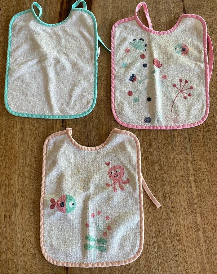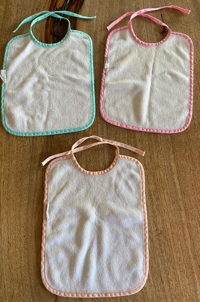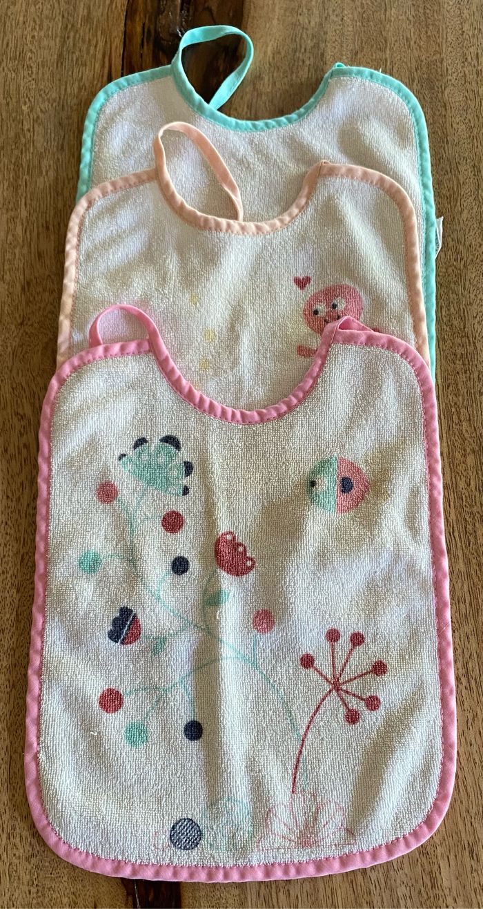 3 Bavoirs éponge, sans taches. 50 % de coton et 50 % de polyester Qui s’attache avec deux ficelles