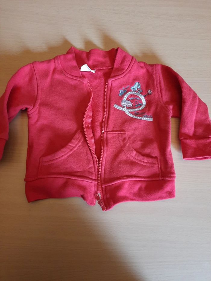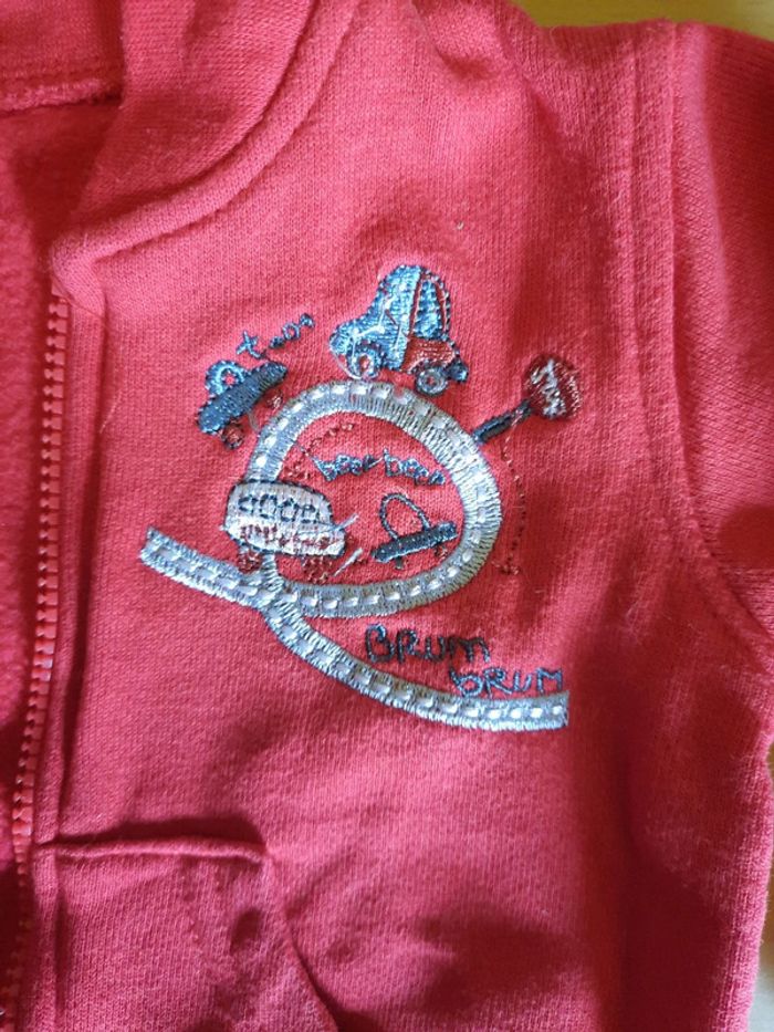 Gilet rouge avec un petit dessin de circuit de voitures Le gilet se ferme mais la fermeture est un peu capricieuse à se mettre. Sinon si vous savez coudre, il suffit de changer la tirette