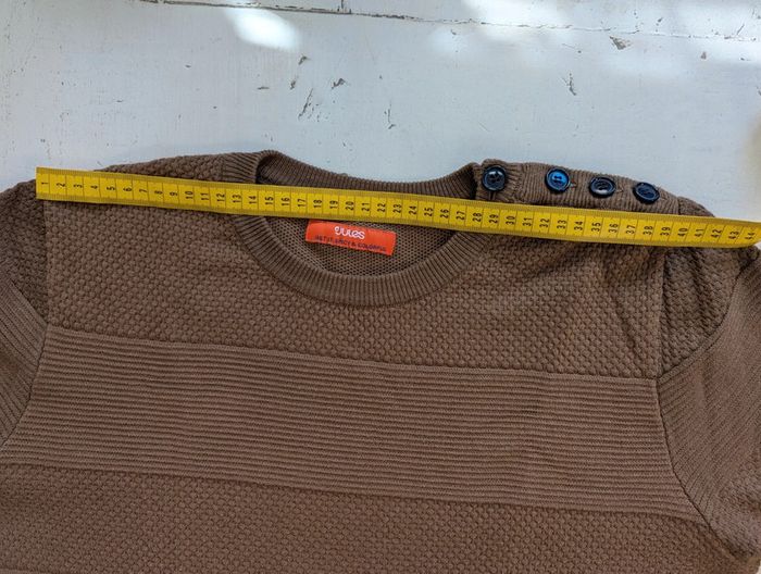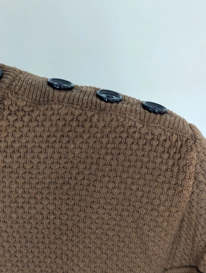 Pull en maille texturé marron avec empiècements en relief, rangée de boutons décoratifs sur l’épaule. Coupe droite, confortable. - Marque : Jules - Type : Pull col rond en maille - État : Très bon état - Taille : L Détails : - Couleur marron - Boutons sur l’épaule gauche - Effet de textures en bandes alternées - Maille douce et légèrement extensible Mensurations : - Largeur aisselle à aisselle : 54 cm - Longueur épaule à base : 62 cm environ D'autres vêtements pour homme #HommeDLau à vendre dans mon dressing : n'hésitez pas à faire des lots pour amortir les frais de port et activer les réductions 😉