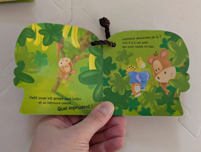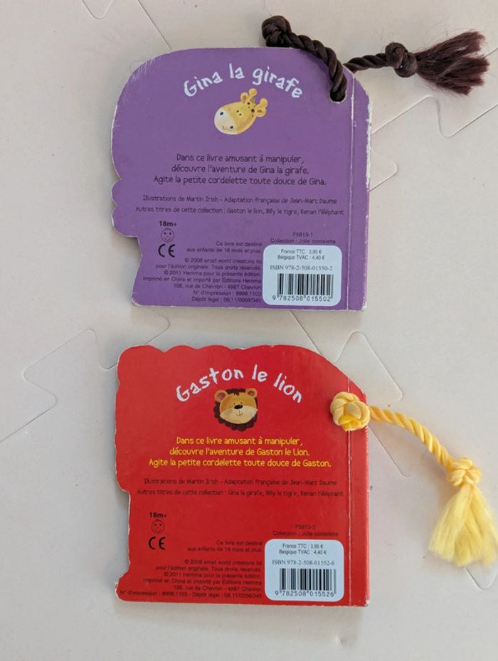 Livres cartonnés pour bébé ou tout-petit, en forme d’animaux avec une petite queue en ficelle à manipuler : - Âge recommandé : Dès 18 mois - Éditeur : Hemma 📗 Gina la girafe : ISBN : 9782508015502 📗 Gaston le lion : ISBN : 9782508015526 État : Bon état général. Coins un peu frottés mais pages propres et solides. Queue intacte sur les deux. D'autres livres, jeux et jouets à vendre dans mon dressing #LivresDLau / #JeuxetJouetsDLau : n'hésitez pas à faire des lots pour amortir les frais de port et activer les réductions 😉