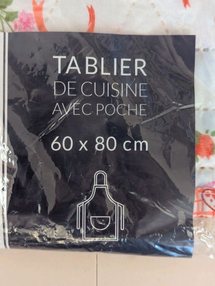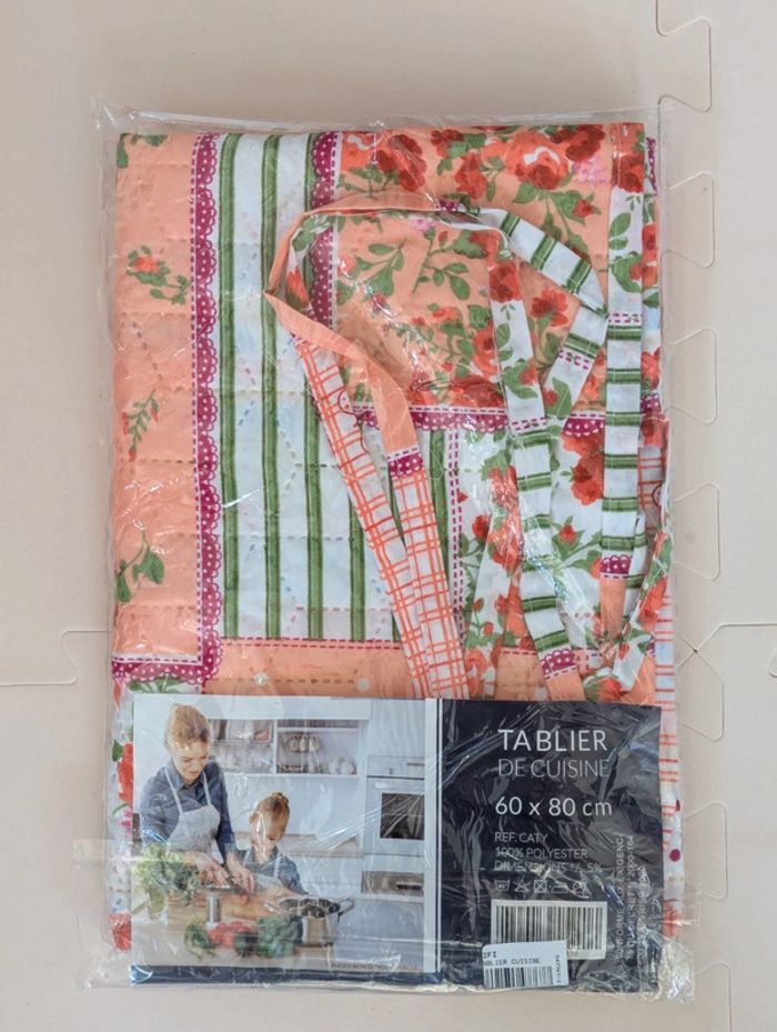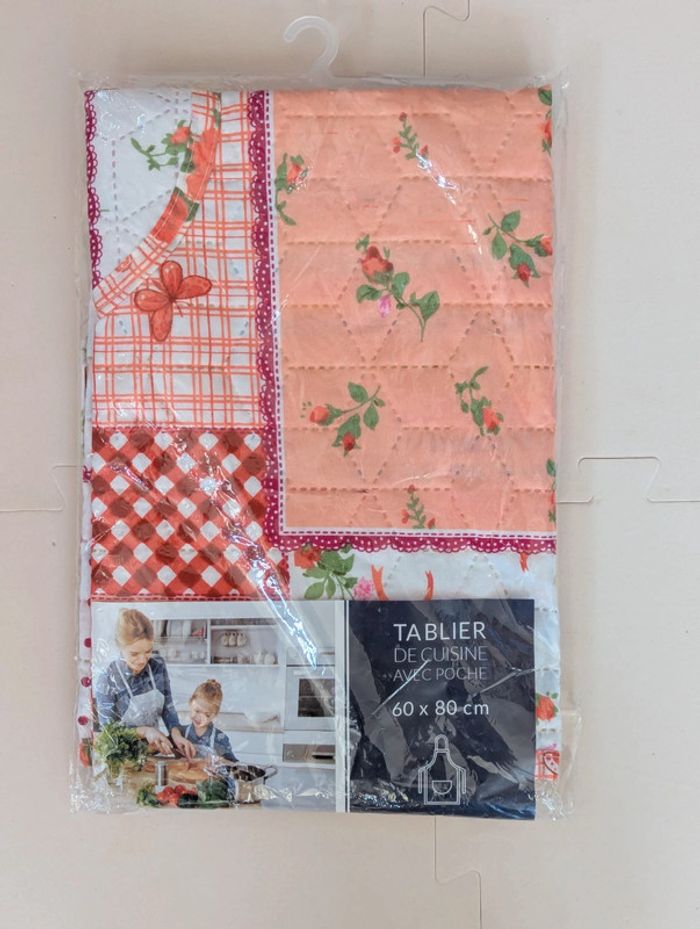 Tablier de cuisine fantaisie. Motifs floraux et à carreaux façon patchwork. Modèle avec poche centrale. - État : Neuf sans étiquette (emballage présent mais ouvert), Aucun défaut - Matière : 100 % polyester - Couleurs : Dominantes rose, vert, orange, blanc, rouge - Détails particuliers : Motifs patchwork floraux et géométriques, surpiqûres décoratives, poche centrale - Dimensions : 60 x 80 cm