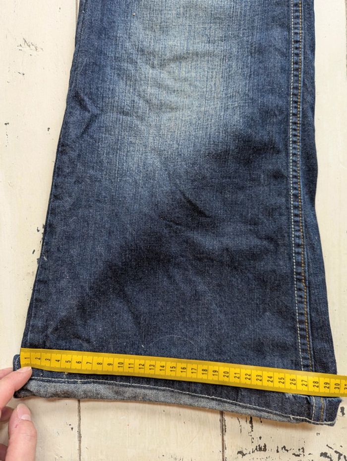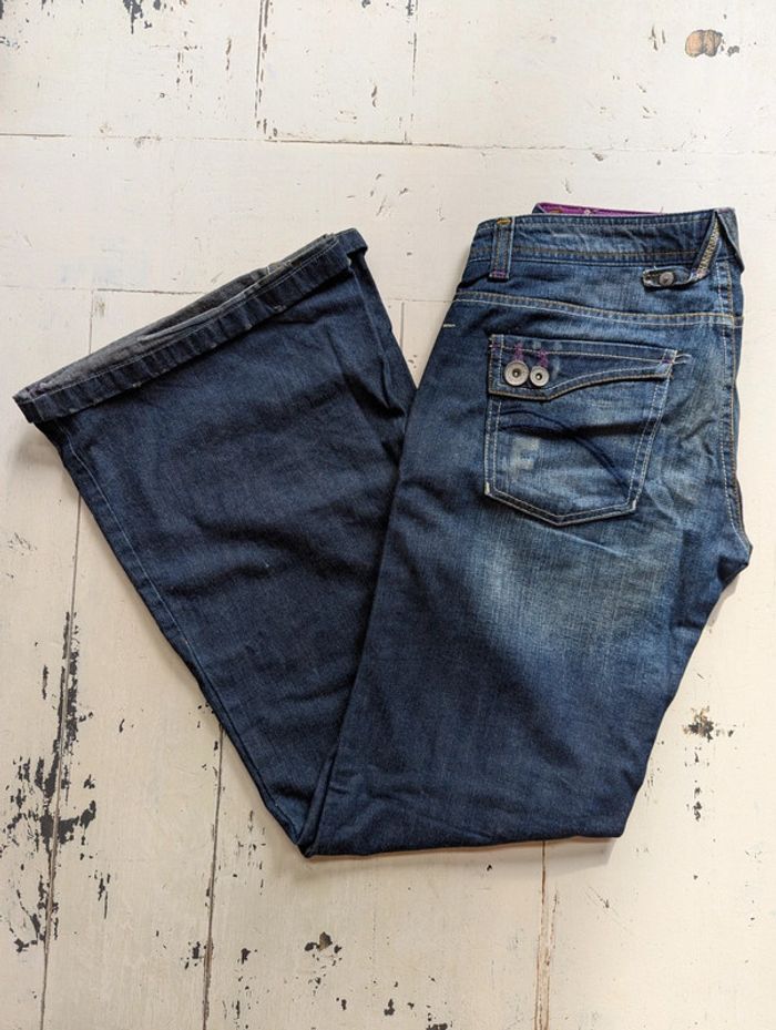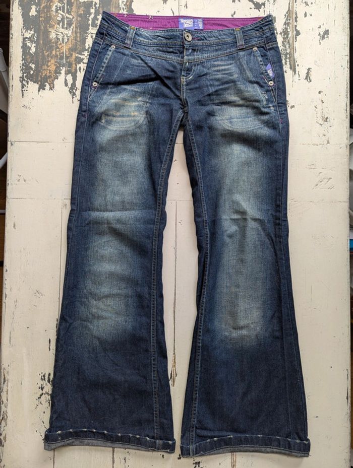 Jean flare effet usé de la marque Bershka Denim. Taille 38 (EUR), 28 (MEX), 10 (UK), 6 (USA). 100% coton. - Coupe flare / bootcut, idéal pour un style Y2K - Détails violets sur les coutures et l'intérieur de la ceinture - Effet délavé et usé - Poches arrière à boutons - Très bon état général, quelques signes d'usure visibles sur l'ourlet (voir photos), pas d'usure à l'entrejambe 📏 Dimensions : - Longueur totale : 106 cm - Largeur taille : 42 cm - Largeur bas de jambe : 27 cm - Hauteur fourche : 20 cm D'autres vêtements pour femme #FemmeDLau à vendre dans mon dressing : n'hésitez pas à faire des lots pour amortir les frais de port et activer les réductions 😉