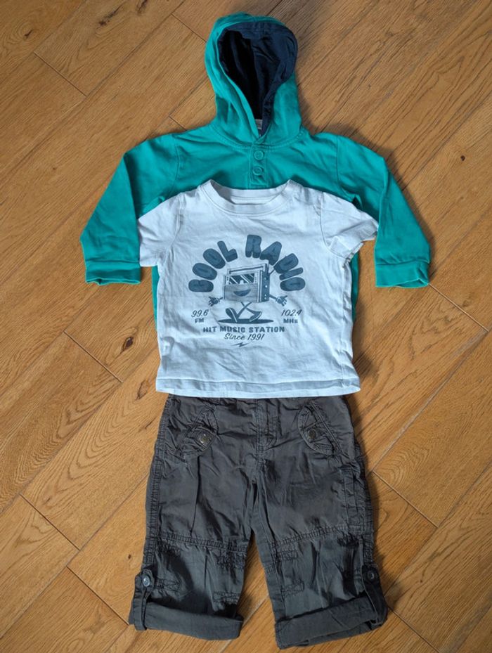 Tenue mi-saison en taille 3 ans : - un pantalon fin de marque 3 suisses, transformable en pantacourt, coloris gris - un sweat vert Papagino - un tee-shirt blanc La Redoute Très bon état D'autres vêtements bébé à vendre dans mon dressing #36moisDLau : n'hésitez pas à faire des lots pour amortir les frais de port et activer les réductions 😉