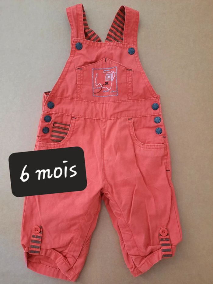 Salopette mi-saison en toile légère de marque DPAM Taille 6 mois Coloris rouge thème "pirate" Jambes retroussables Excellent état, très très peu portée D'autres vêtements bébé à vendre sur mon profil : n'hésitez pas à faire des lots pour activer les réductions et amortir les frais de port 😉 #6moisDLau