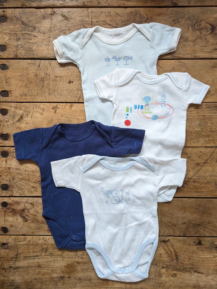 Lot de 4 bodies manches courtes en taille #3moisDLau - diverses marques - encolure bateau : - 1 body sans marque, blanc avec motif - 1 body Tex, bleu marine uni en tissu côtelé - 1 body Verbaudet, blanc avec motif (taille indiquée sur le body = 1 mois mais taille grand) - 1 body In extenso, blanc rayé bleu ciel avec motif Très bon état. D'autres vêtements bébé #3moisDLau à vendre sur mon profil : n'hésitez pas à faire des lots pour activer les réductions et amortir les frais de port !