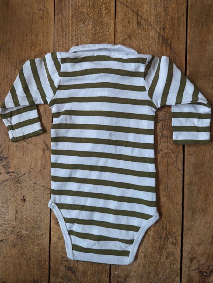 Body à col polo, de marque Bout'chou, en taille #6moisDLau . Manches longues. Rayé blanc / kaki. Excellent état. D'autres vêtements bébé #6moisDLau à vendre dans mon dressing : n'hésitez pas à faire des lots pour activer les réductions et amortir les frais de port !