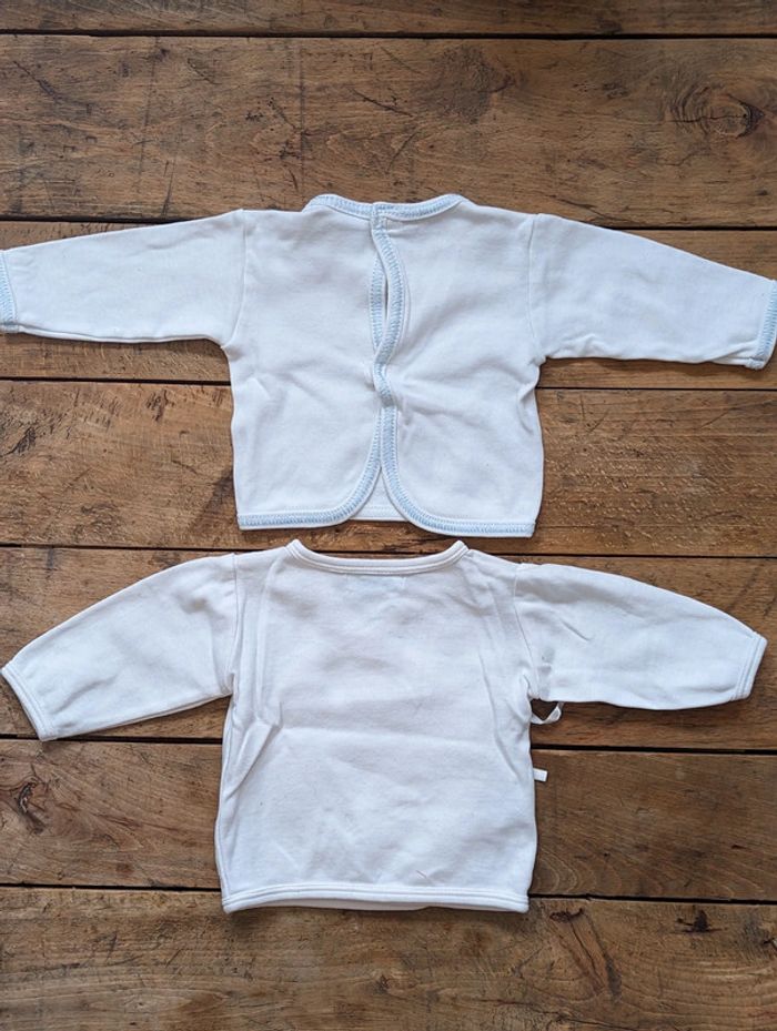 Lot de 2 brassières blanches, motifs discrets, taille naissance #NaissanceDLau : - 1 brassière à fermeture croisée de marque Hema à nouer - 1 brassière avec pressions au dos, de marque Marty Très bon état D'autres vêtements bébé #NaissanceDLau à vendre sur mon profil : n'hésitez pas à faire des lots pour amortir les frais de port !