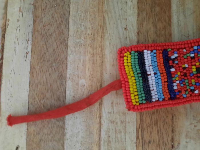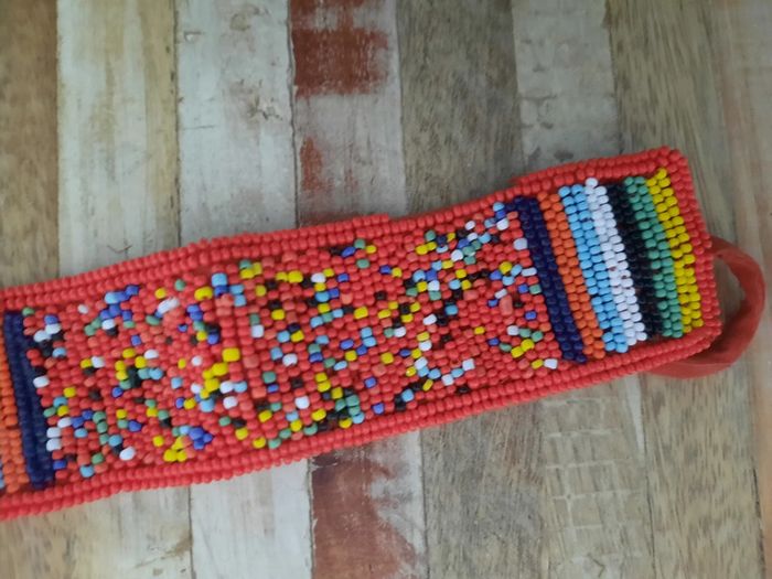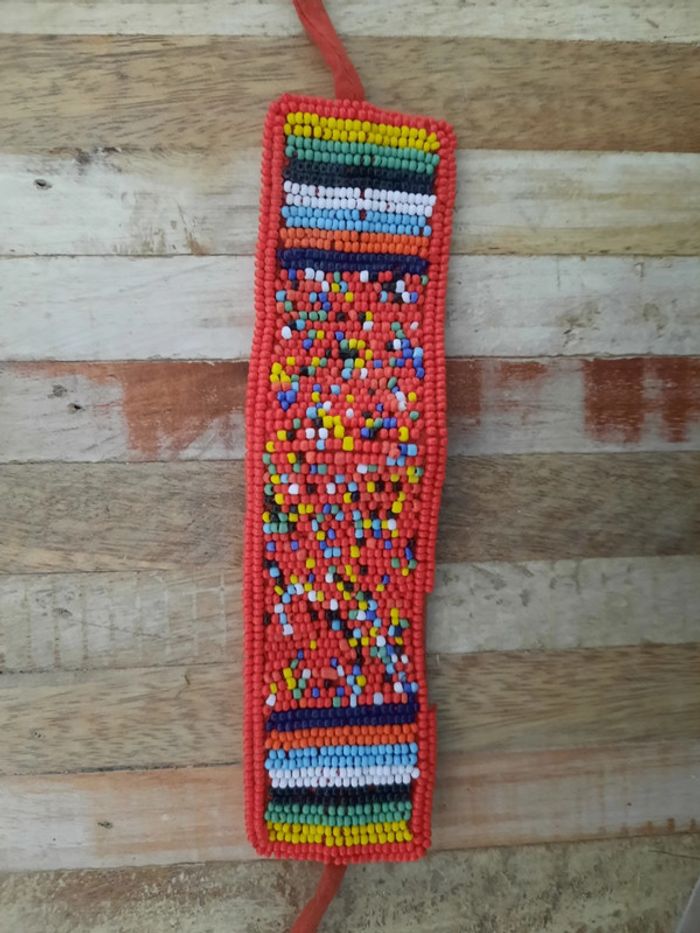 Bracelet manchette tissé en perles rocailles multicolores À nouer Doublé en tissu rouge Il manque quelques perles sur un bord (voir photos) mais le reste tient solidement.