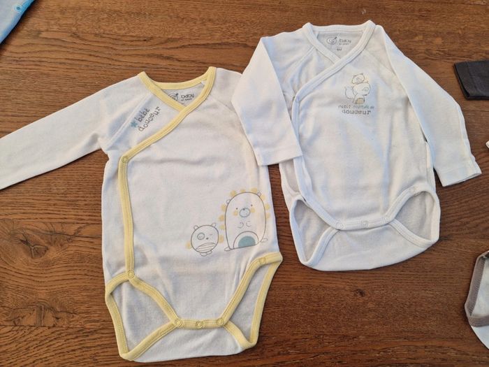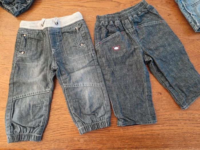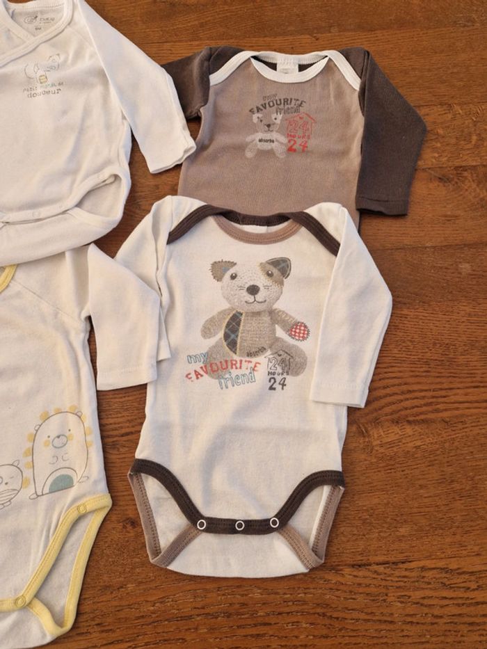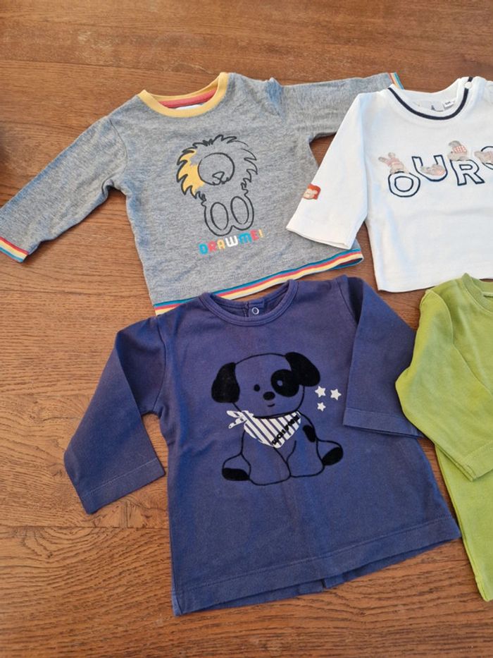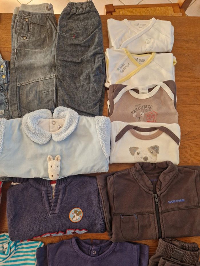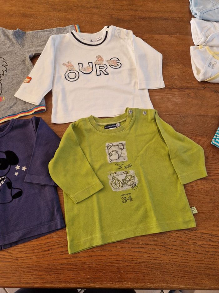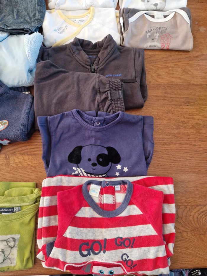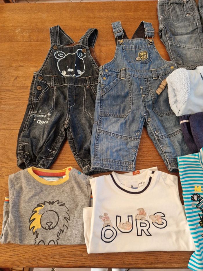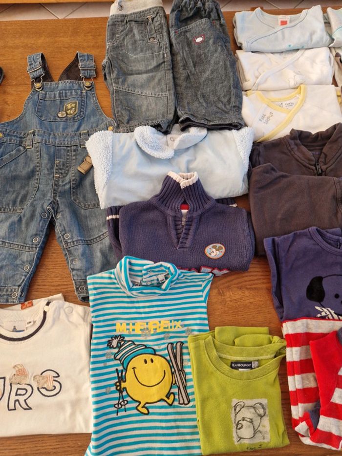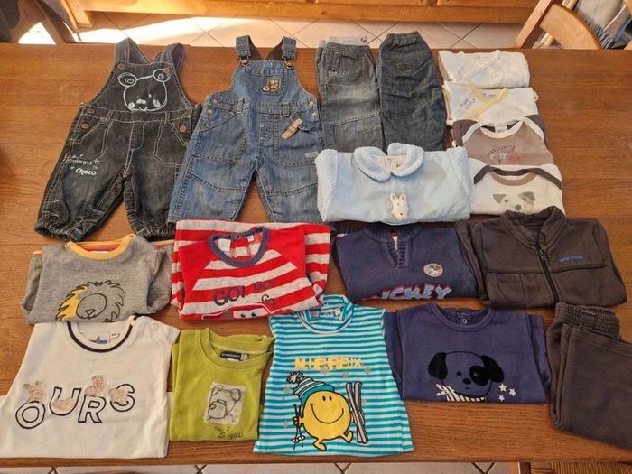 Lot 6 mois pour petit garçon composé de : - 1 pyjama Cars (68 cm), quelques toutes petites bouloches sur la voiture. - 4 bodies manches longues, 2 sont de marque Gémo et 2 de marque Absorba ; bon état. - 2 jeans, l'un Gémo et le second Okaïdi, - 1 jogging de marque Sucre d'Orge, - 2 salopettes en jean (6 mois, 67 cm). L'une de marque Sergent Major, la seconde "Petit Kimbaloo (La Halle) ; celle de La Halle a été un peu plus portée, quelques bouloches à l'intérieur, - 1 pull Mickey (68 cm) de marque C&A ; bien porté, présence de quelques bouloches, - 1 sweat tout doux de marque Sucre d'Orge (6 mois, 67 cm) ; fermeture par pressions à l'arrière, - 4 tee-shirts manches longues de marque Obaïbi, Sergent Major, Sucre d'Orge et Jean Bourget, - 1 sous-pull manches longues "Monsieur heureux", attention taille petit! Il y a les marques suivantes : Okaïdi, Sergent Major, Sucre d'Orge, Absorba Gémo, Disney... Le lot est en bon état général. J'ai essayé de décrire au mieux, n'hésitez pas si vous avez des questions supplémentaires ou si vous souhaitez d'autres photos car j'ai atteint les 20 maxi. #garçon6moisgain_de_place