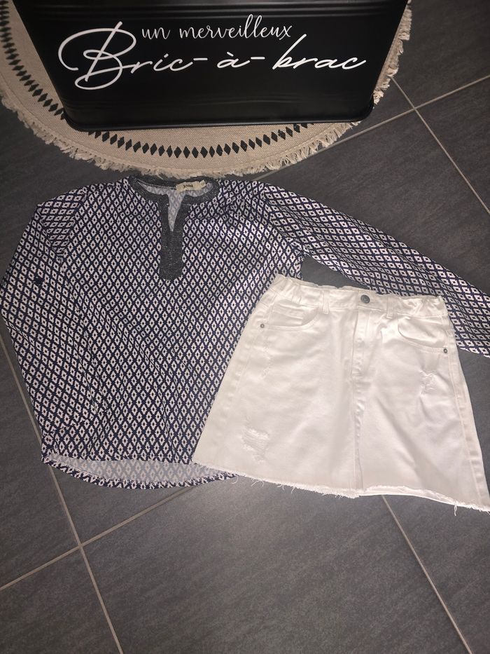 Bonjour 👋 Je vend ce : 👉 jupe kiabi 12 ans Couleur blanc 👉t-shirt ml 12 ans Couleur bleu et blanc motif losange Maison 🏠 non fumeur et sans animaux