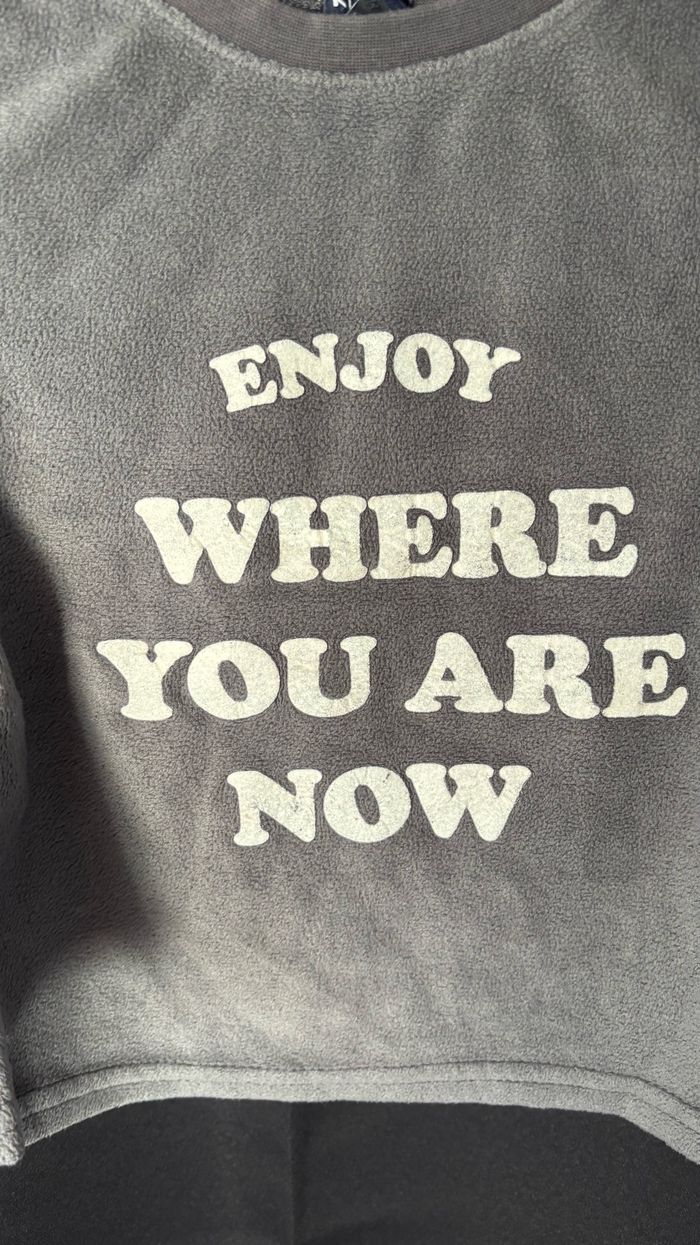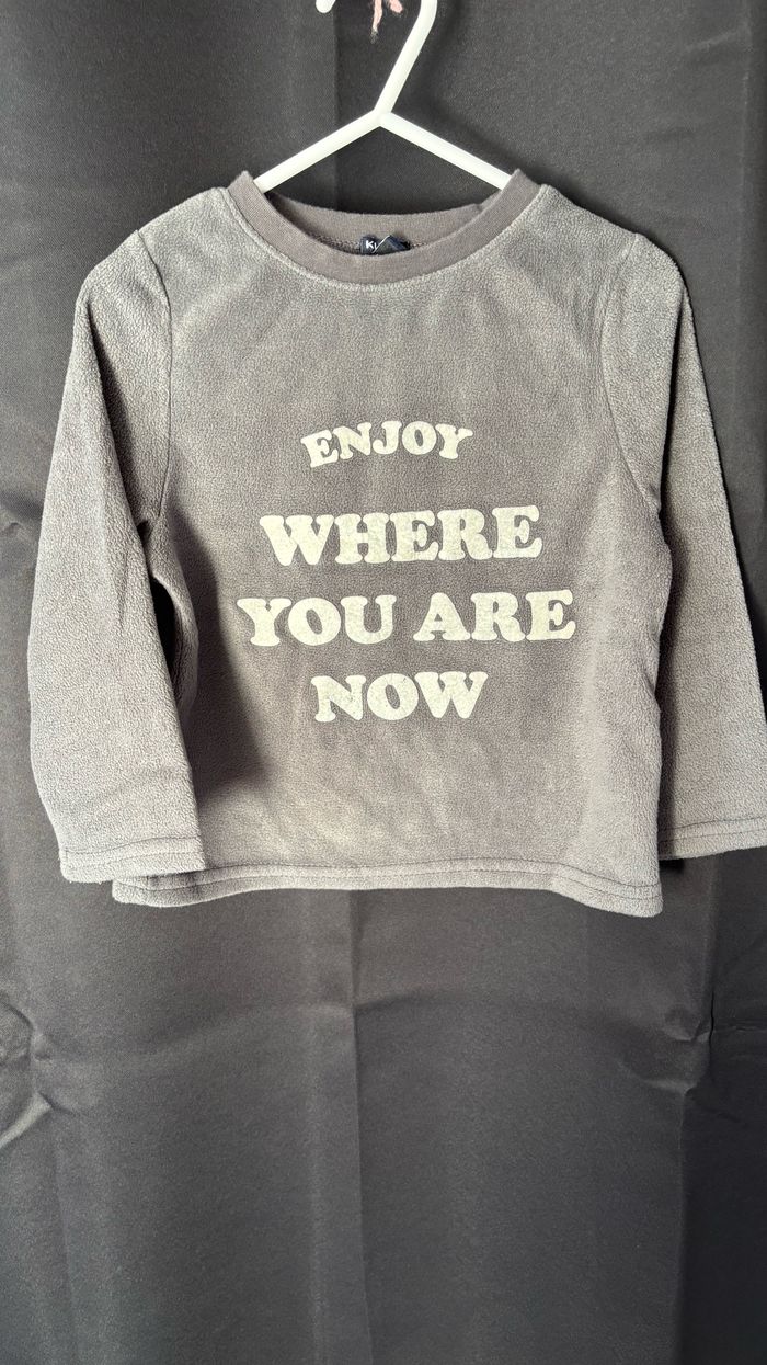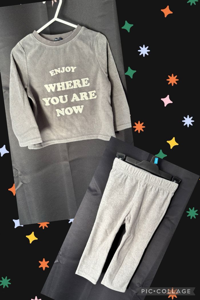 Haut gris foncé avec écriture et pantalon gris clair en velours