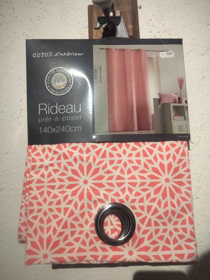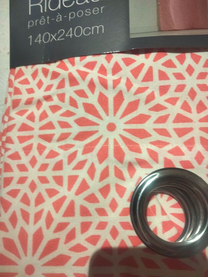 Rideau imprimé Tunis corail 140x240 cm. Avec oeillets. Composition : 100% coton Neuf